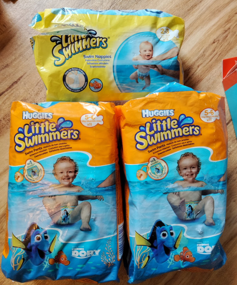 Speedo Swim Seat, Minnow Goggles and Huggies Little Swimmers Nappies and Pants.