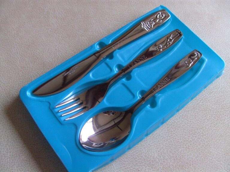 Stainless steel named (Leanne) young child's knife, fork and spoon. Brand new, never used (3+)