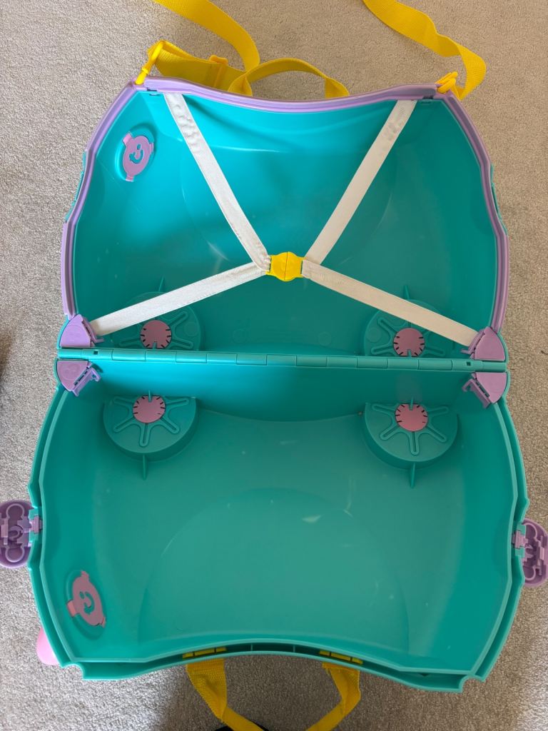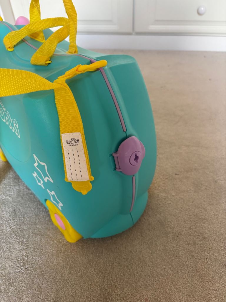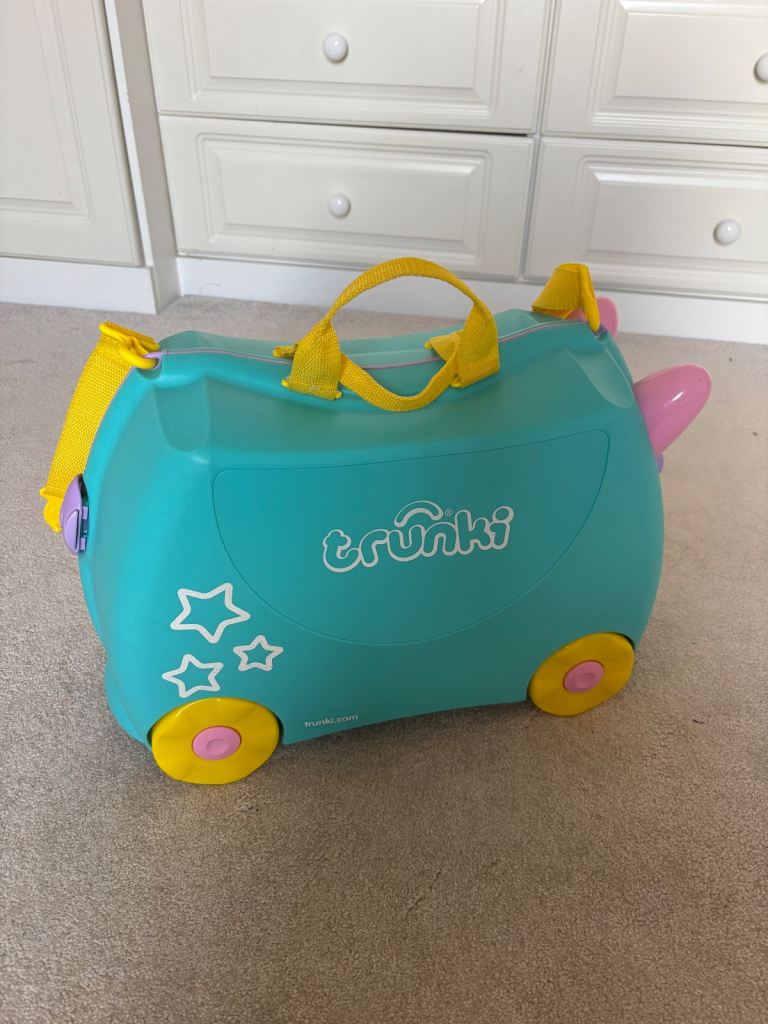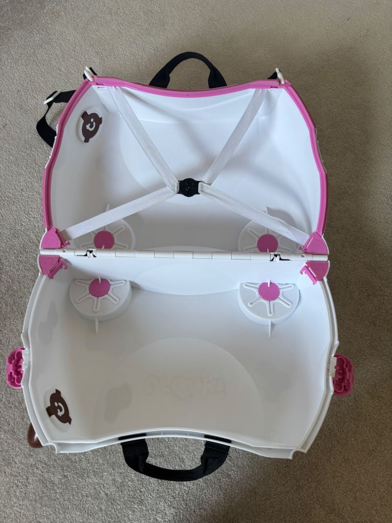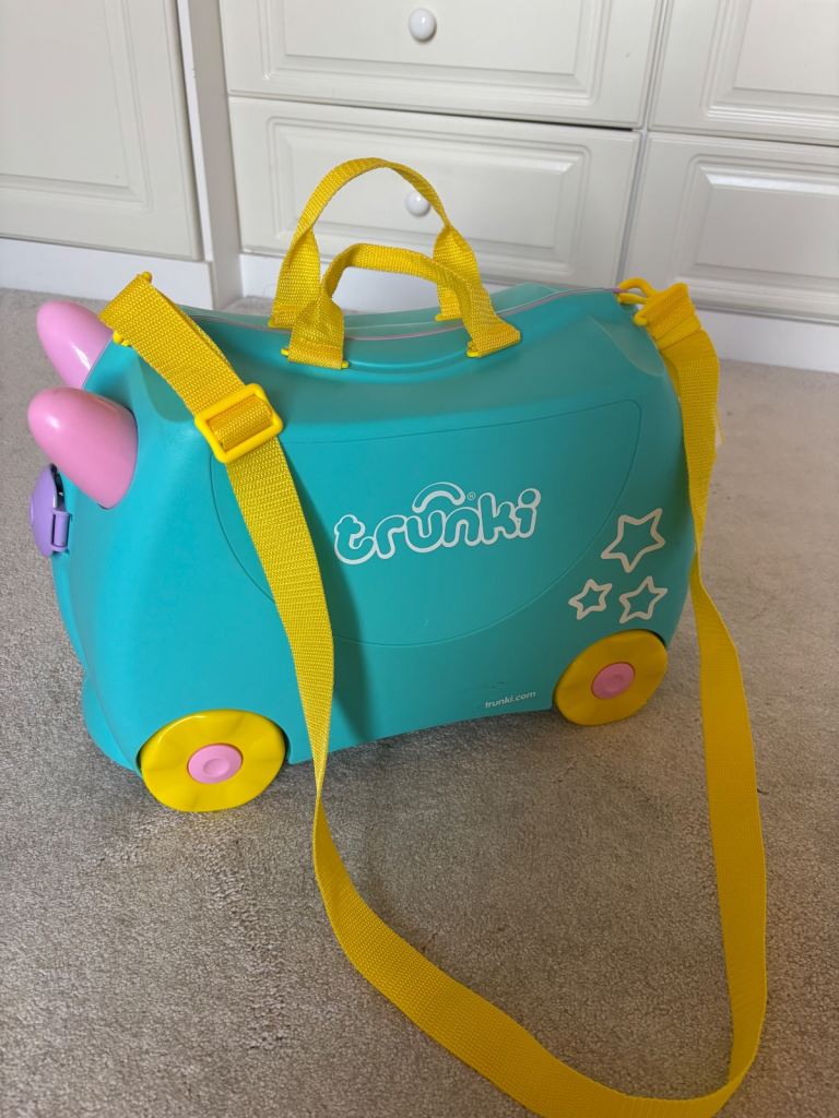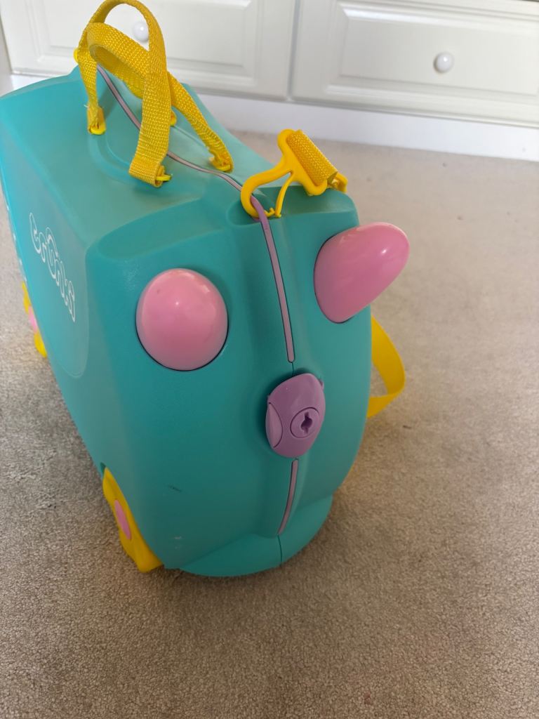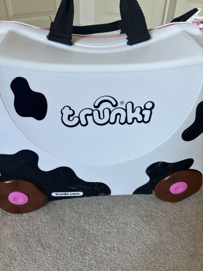 2 x ‘Trunkies’. These are fantastic ride on suitcases for kids that double up as hand luggage. 1 x cow style and 1 x unicorn style. My daughters have now grown out of them. Includes pull along strap - perfect for the airport. Also includes a twist lock. Hard case, 4 x wheels. Clips shut. In good condition but a few scuff marks particularly on the cow as shown in photos. Would sell individually for £20 each or £35 for both.