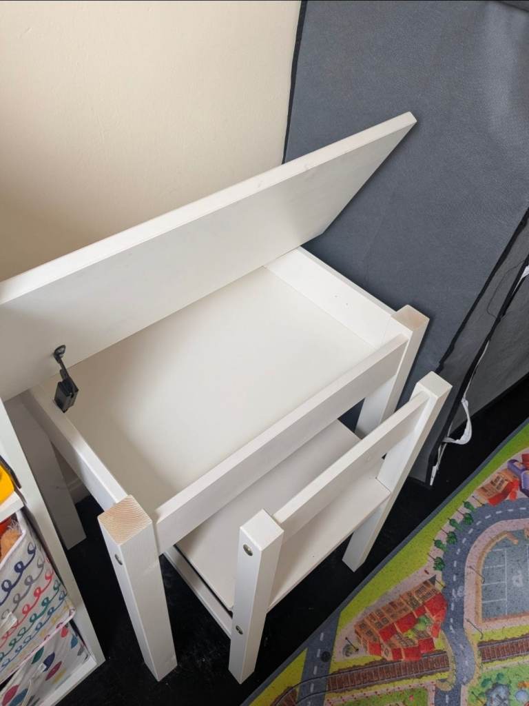 Wooden desk and chair. Desk top lifts up to reveal storage space.