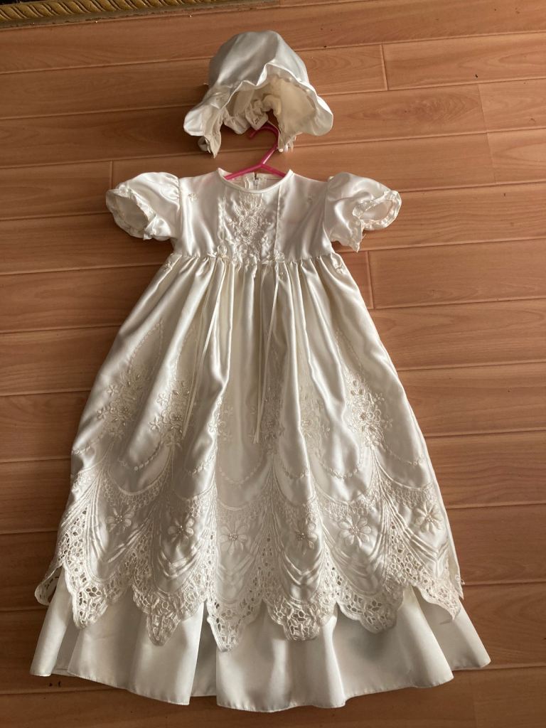 12 to 18 months old . Christening or communion dress with bonnet . Worn once excellent condition. Payed £50 . 20 years ago looking for £27. cheap at today’s prices . Pick up Norton Stockton ts20 area.