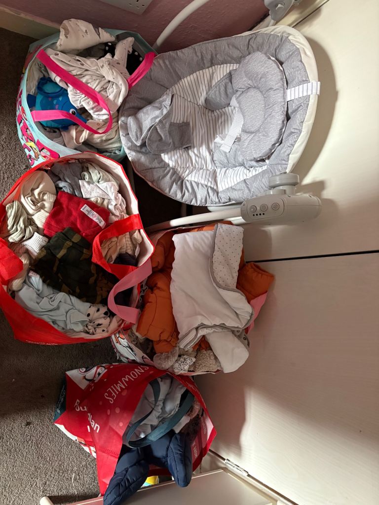 4 bags of baby clothes and 1 box full with mainly 0-3 and 3-6 also sleeping bags and snow suits (all boys)
