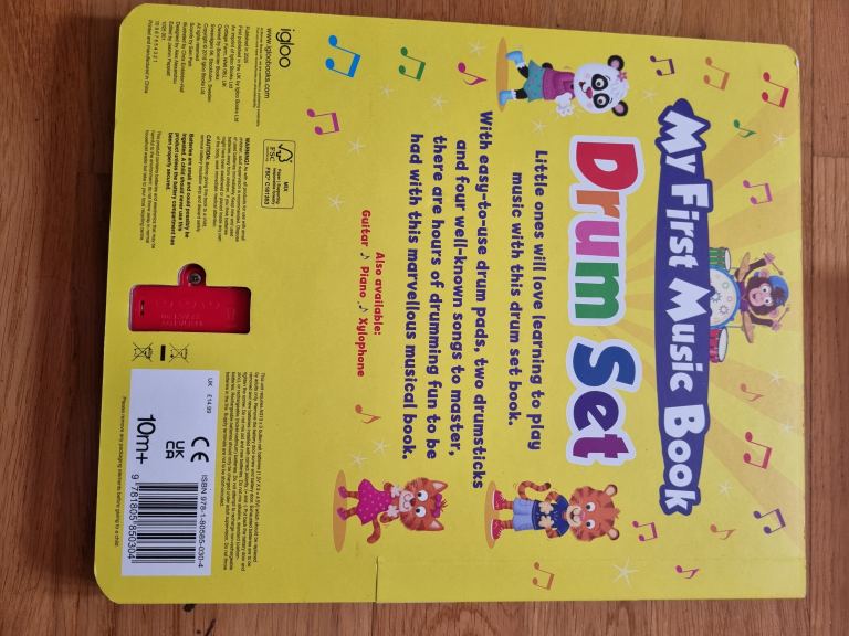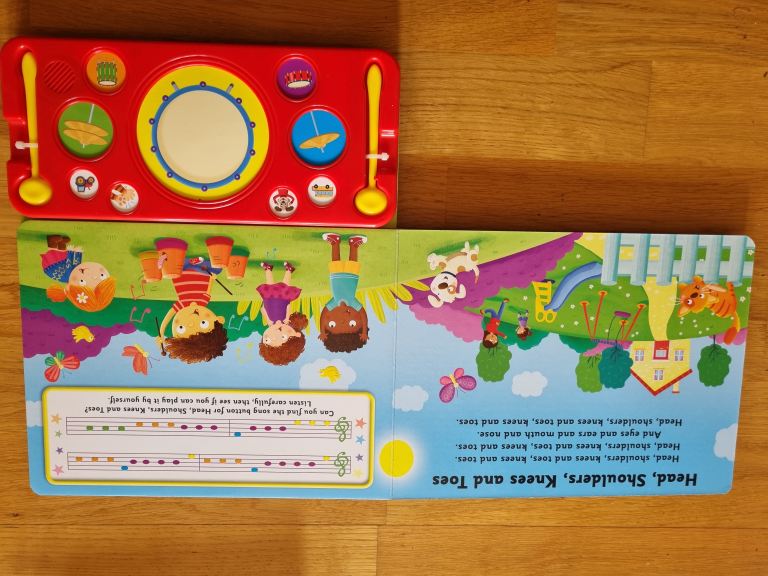 Easy to use drum pads, 2 drum sticks, 4 well known songs/ nursery rhymes