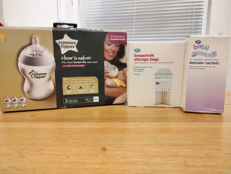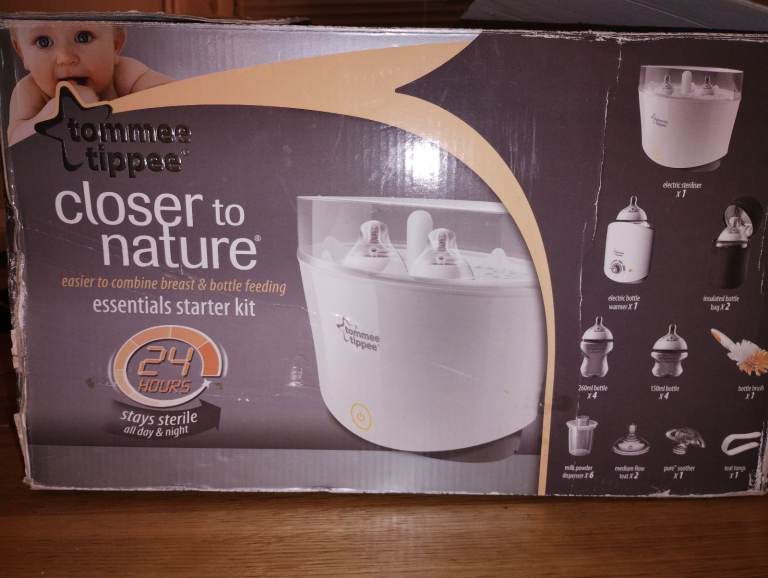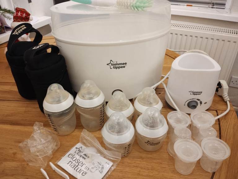 Tommee Tippee steriliser set.Steriliser, bottle warmer,2 insulated bottle holders,bottles,powder storage pots,milk storage bags, steriliser descaler and accessories.