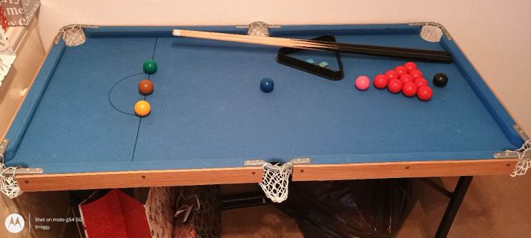 Snooker/Pool table suitable for children. Measuring 4' x 2' and complete with two cues plus snooker and pool balls and chalks