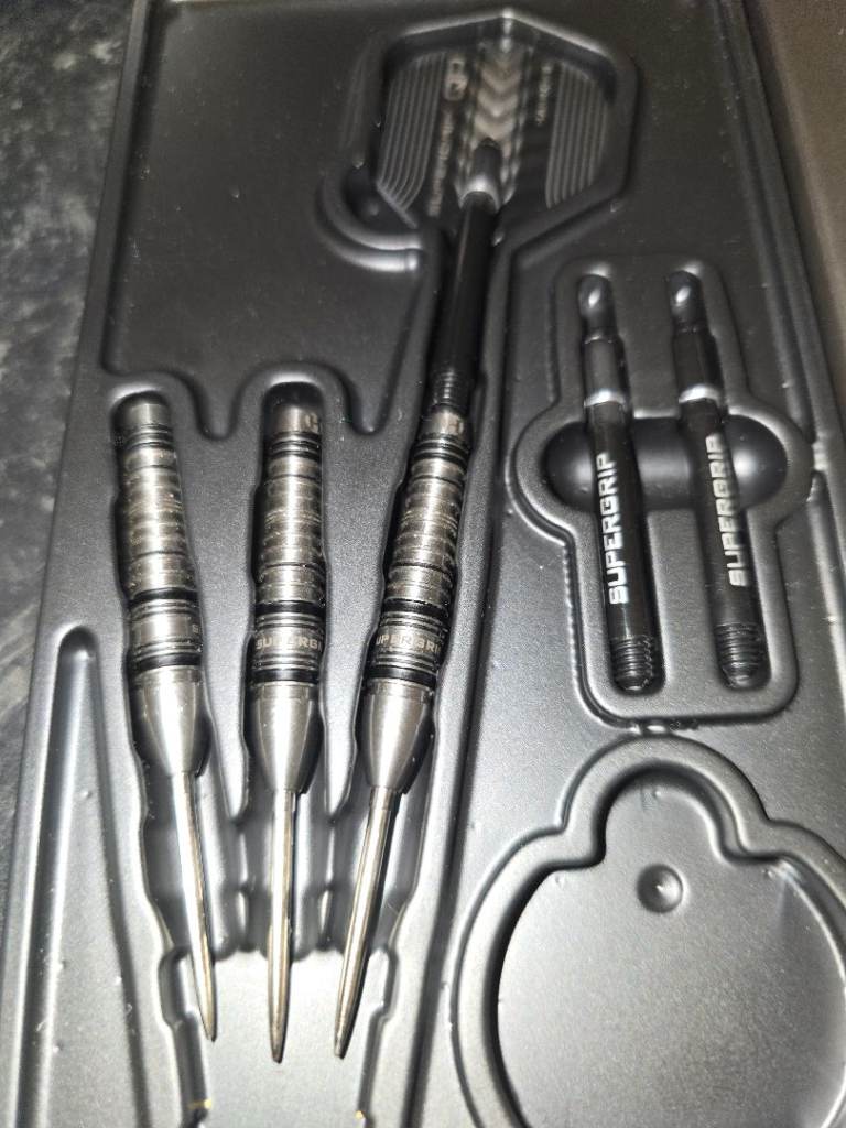 23 g supergrip bombs. Too light for me flights & stems have never been used as I used k flex. Would possibly swap for some 24 or 25g torpedo or bomb shape darts.