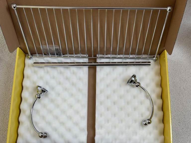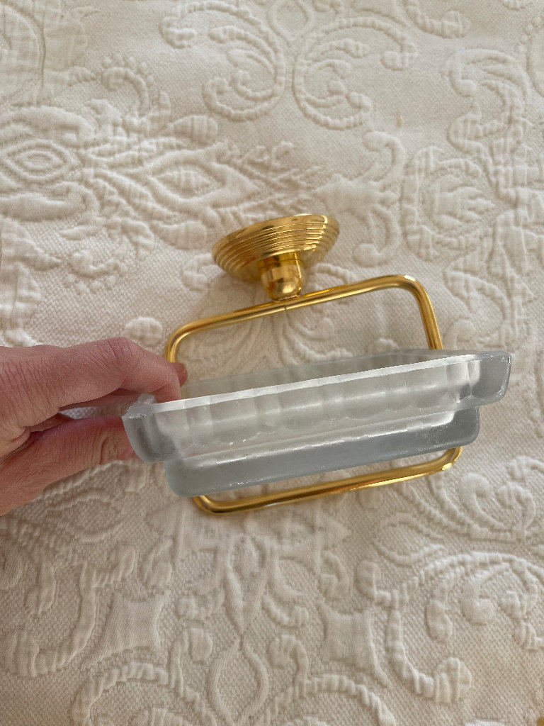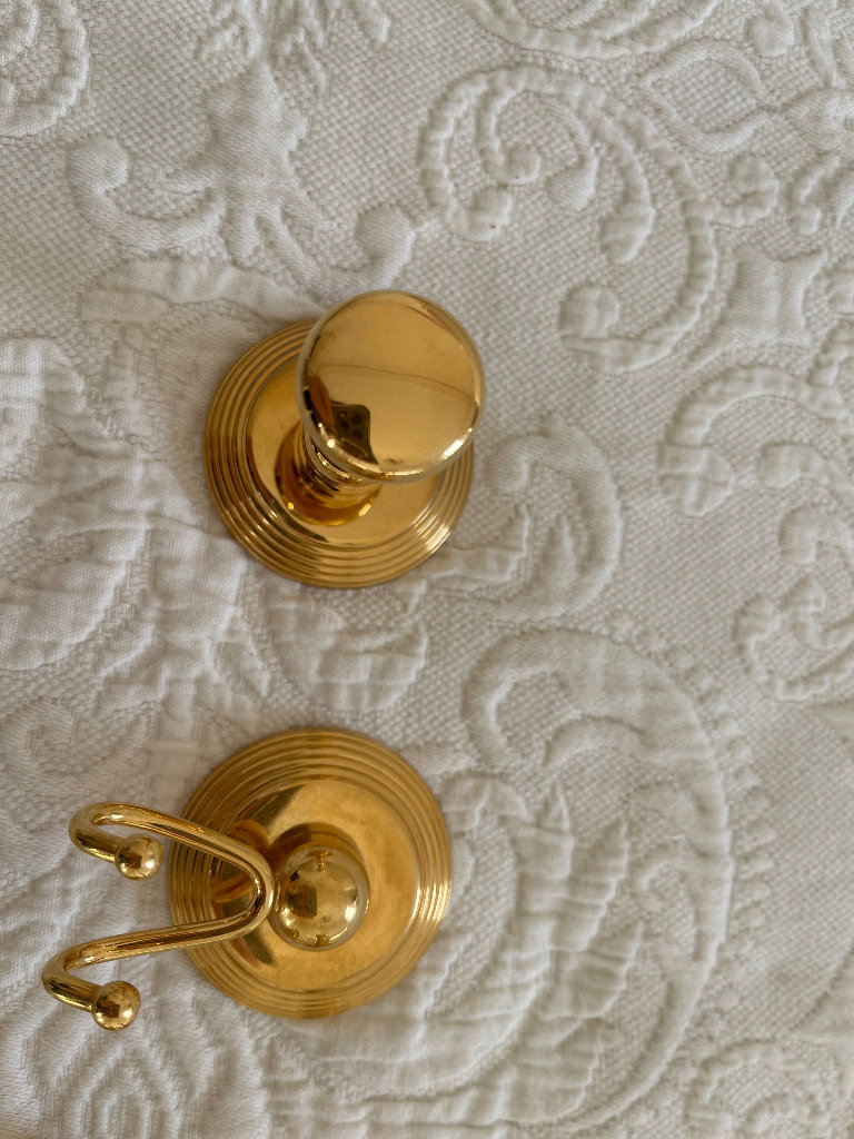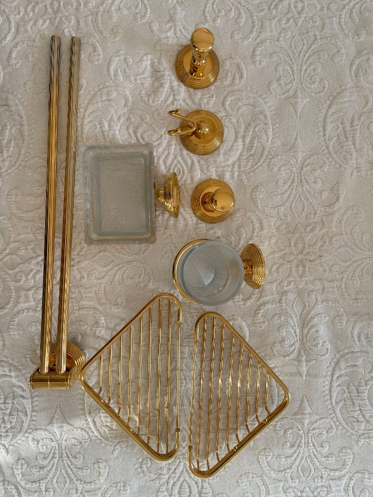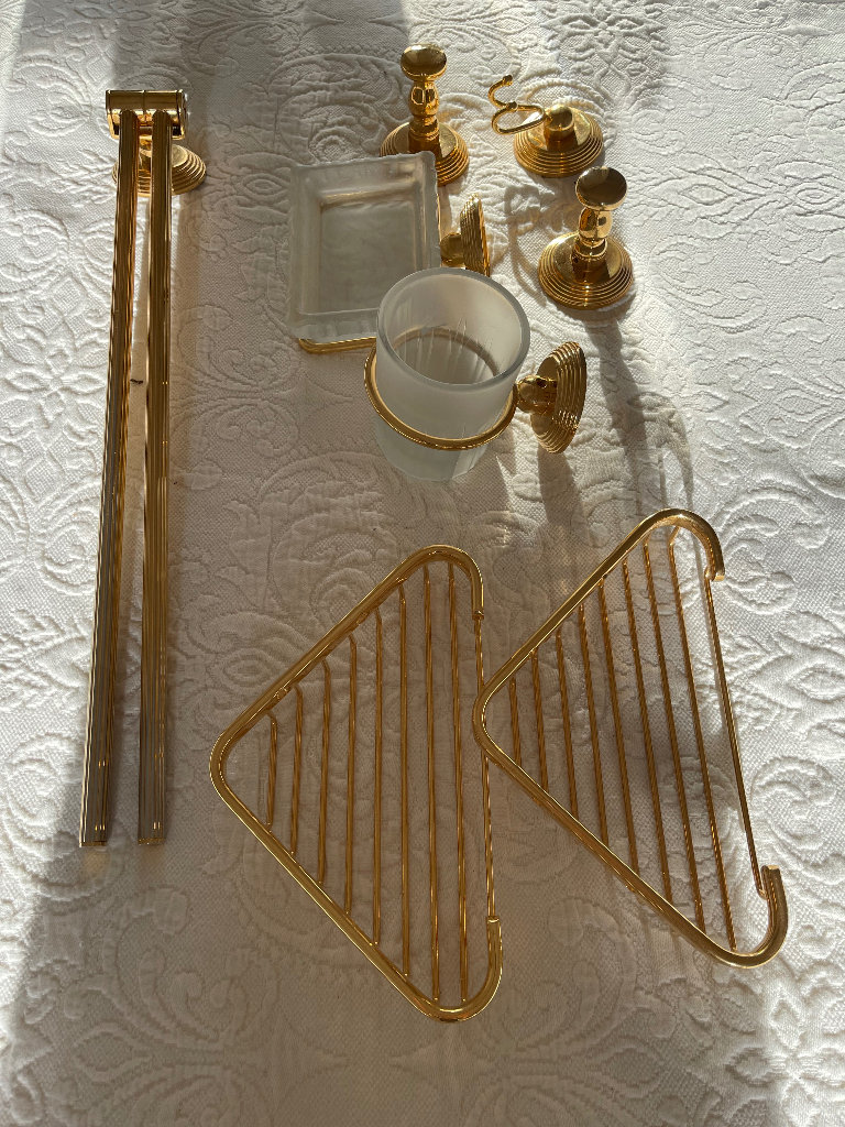 PVC gold bathroom accessory set, Cristal&Bronze. Consists of one long double towel rail, 2 different hooks, one soap holder, one toothbrush tumbler holder and two shower accessory holders.