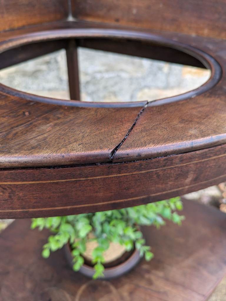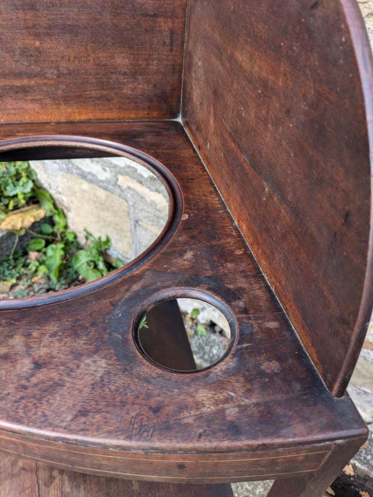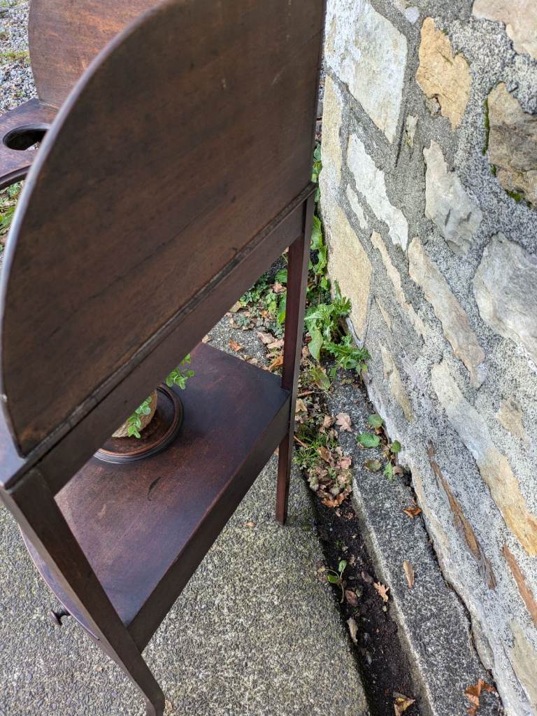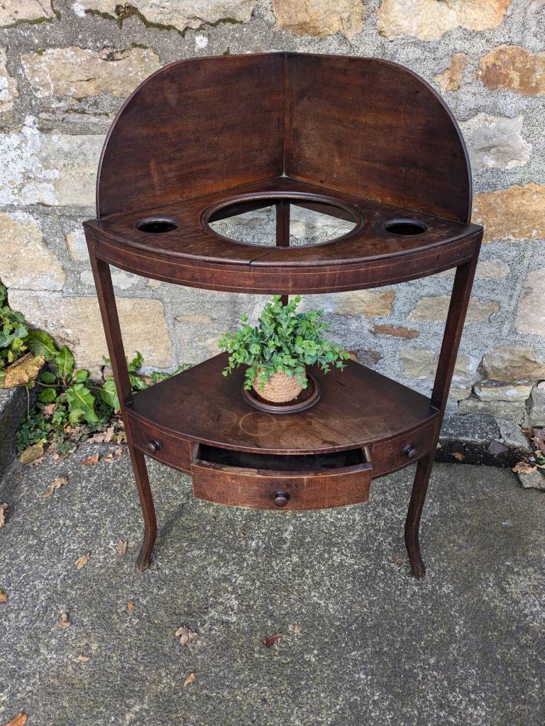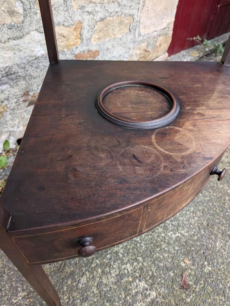 Beautiful antique George lll corner wash stand. It shows its age with scratches and marks and a split in the wood but still a nice old item. The split in the wood does not weaken the top as the frame underneath supports the top. Could also be used as a plant stand.