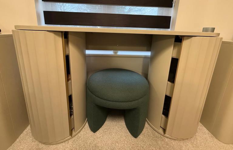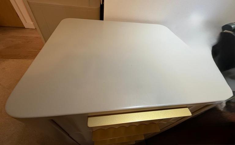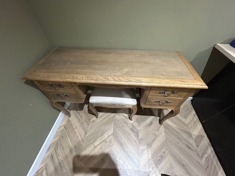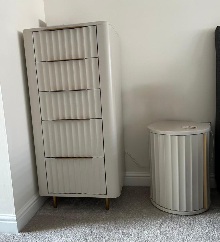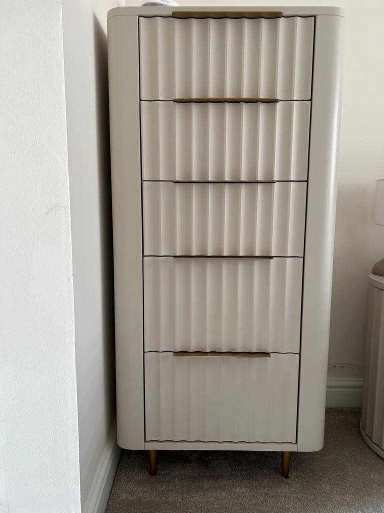 This is a current Barker & Stonehouse range (Retailing at £3,500). Dressing Table with Mirror, 2 three Drawer Chests, 2 five Drawer Tall Chests, 2 Bedside Tables. Images show some items with feet attached & some items without but feet are included for all pieces. I have highlighted any flaws in the close up photos but these are minimal. The dressing table has shelves inside both doors making them ideal for storage. As do the bedside tables. Approx 3 years old. House move forces sale.