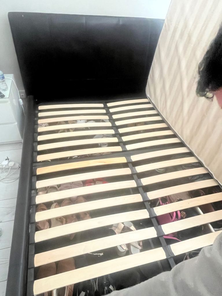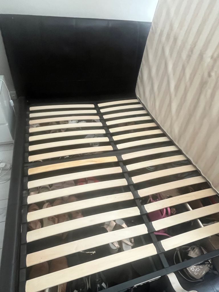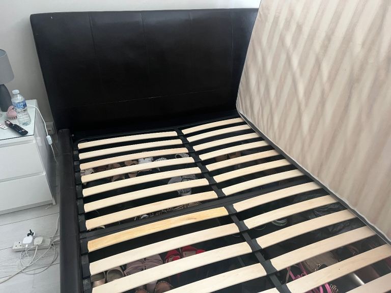 Gas lift kingsize ottoman storage bed. Brown leather, solid. Good as new only selling as downsizing and changing colour scheme.