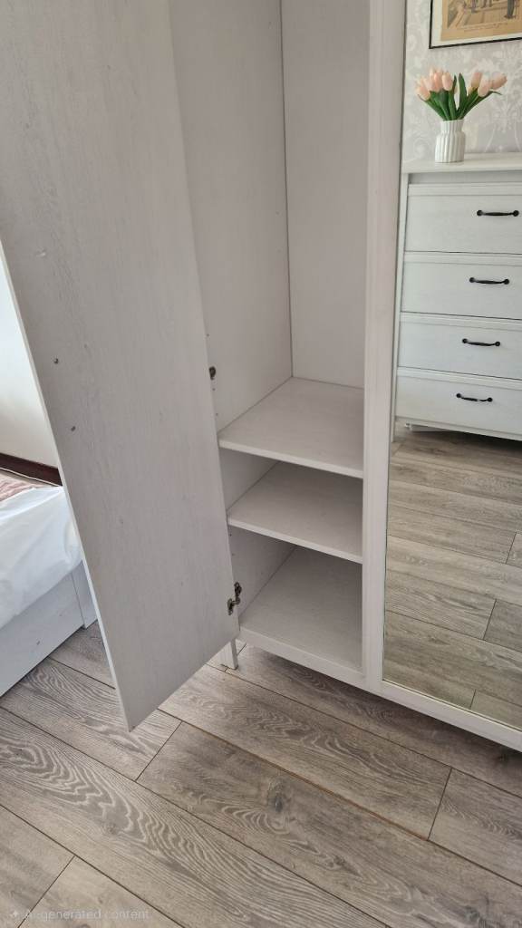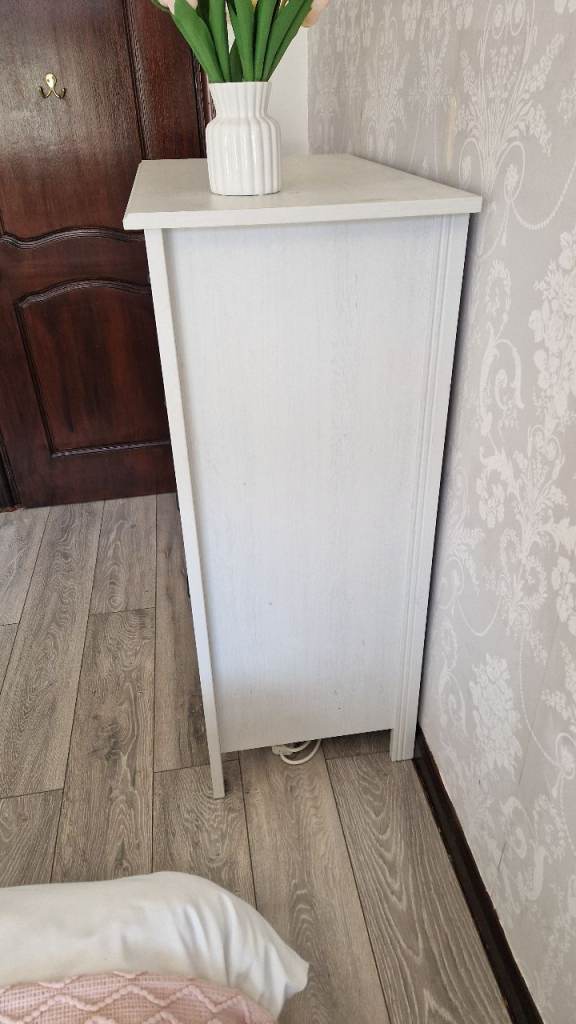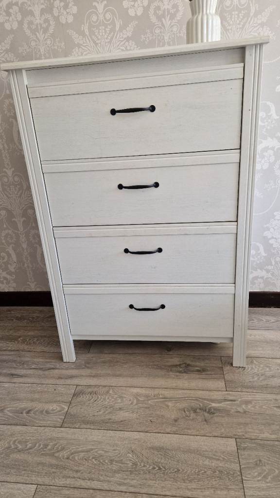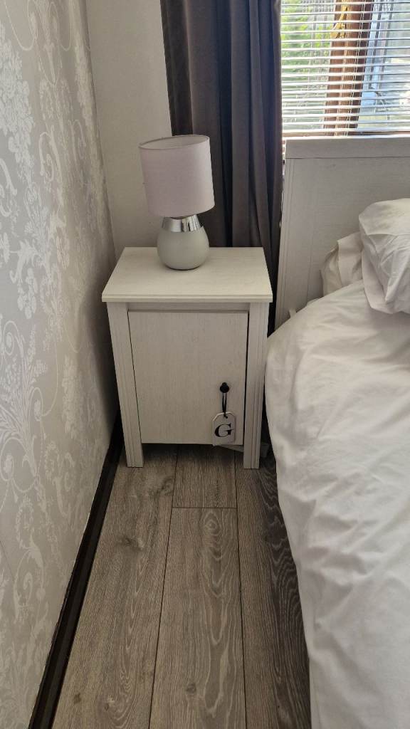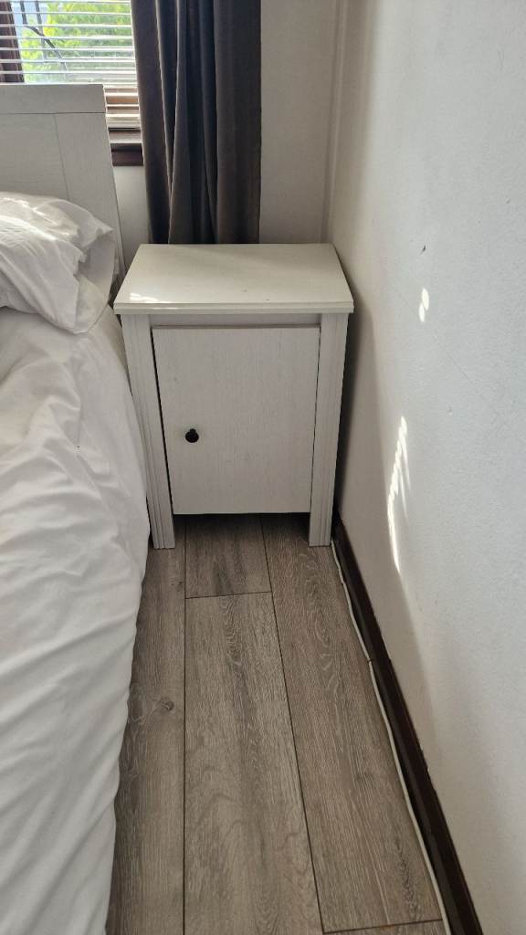 Full bedroom suite including double bed, with mattress , two bedside cabinets, 3- door wardrobe and 4- drawer chest from a past IKEA Hemnes range. Lovely whitewashed pine finish. Black handles. Everything in beautiful condition. House move forces sale.