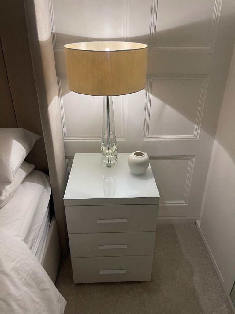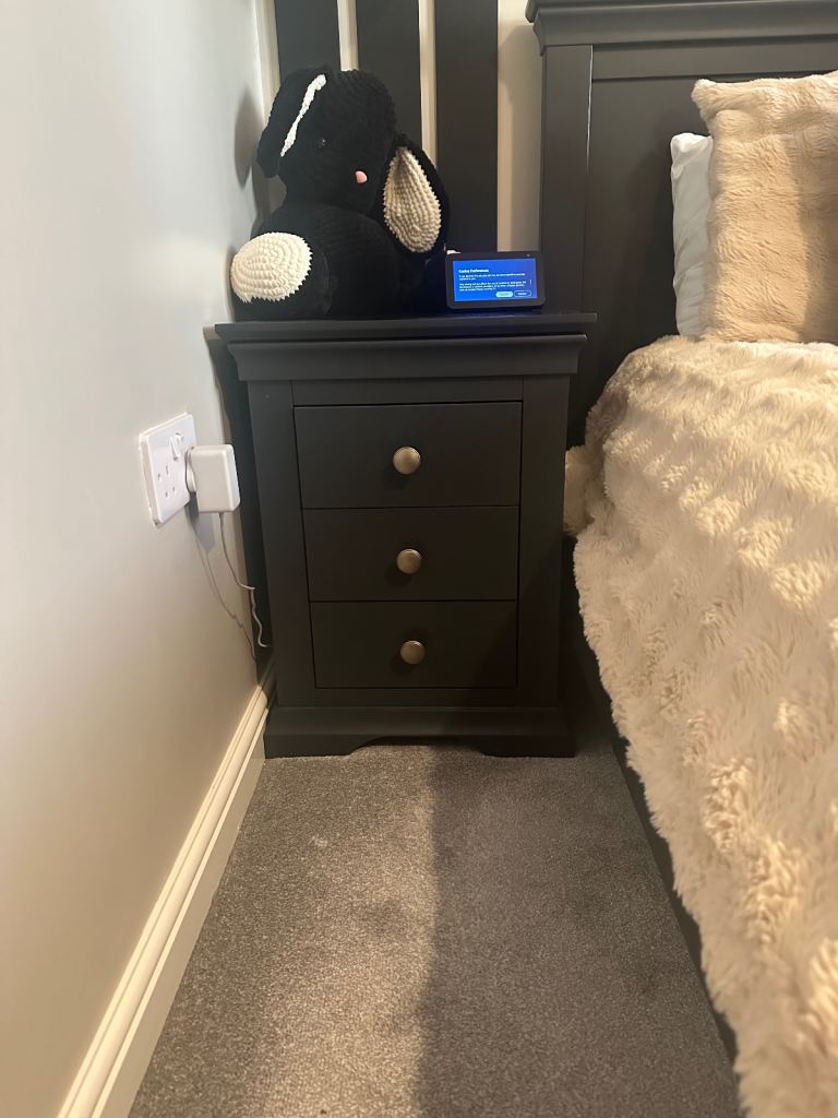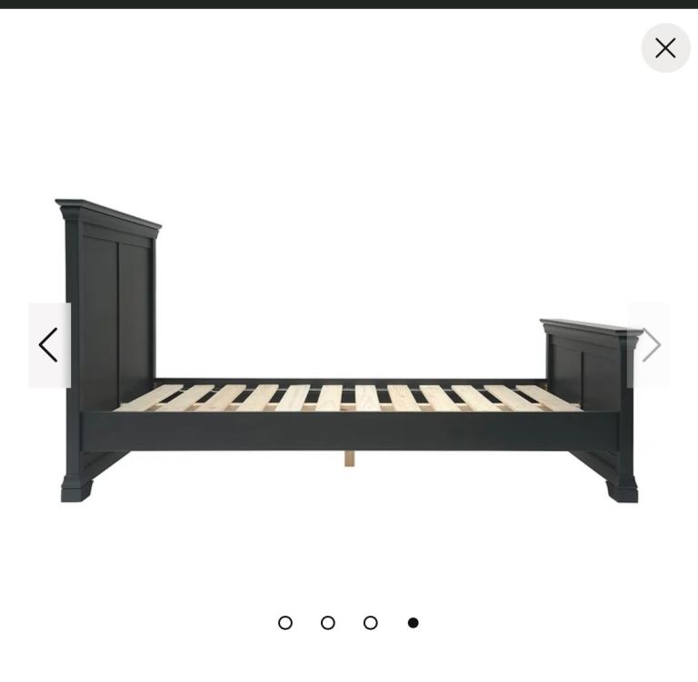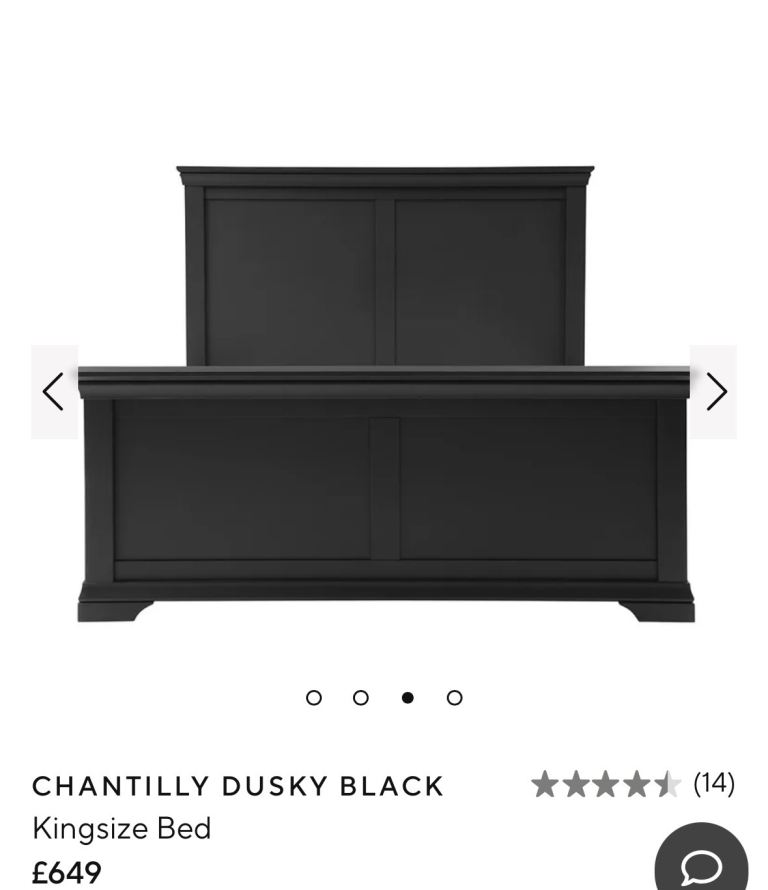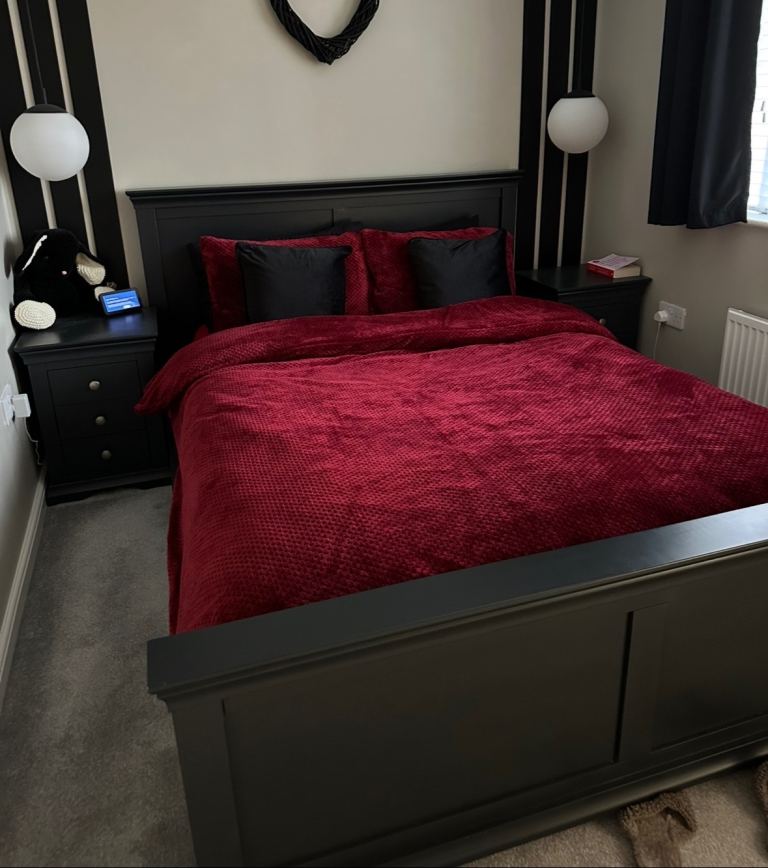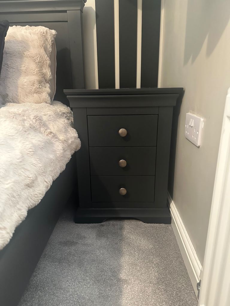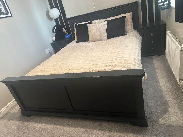 Black kingsize bedframe and two 3 draw bedside tables. Immaculate condition. Only 2 years old. Selling due to needing a smaller bedframe for room and colour change. The bed is solid and very sturdy.