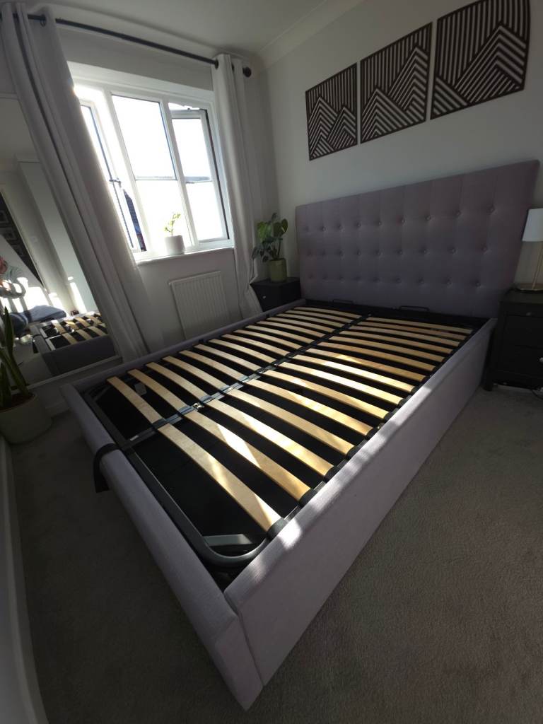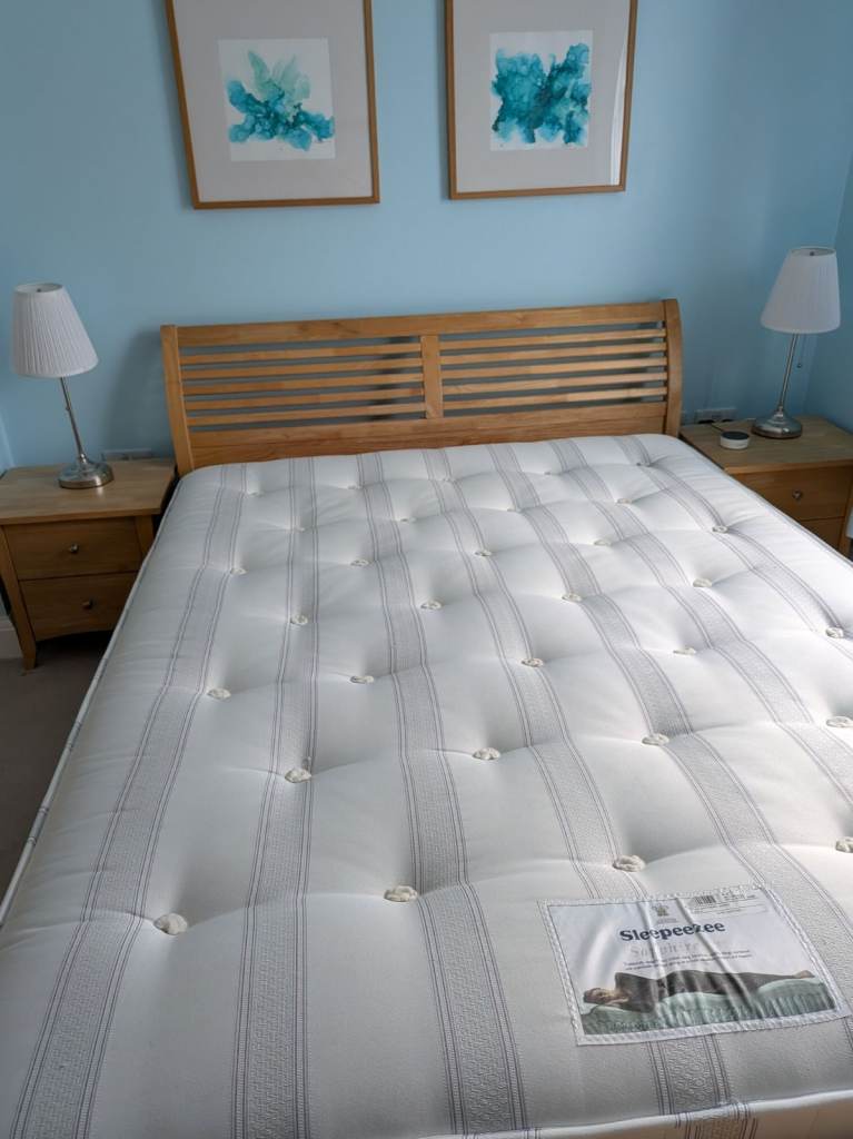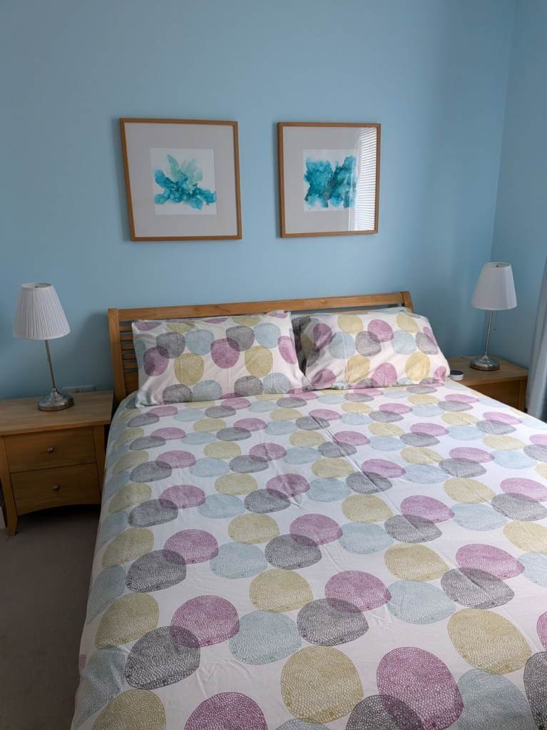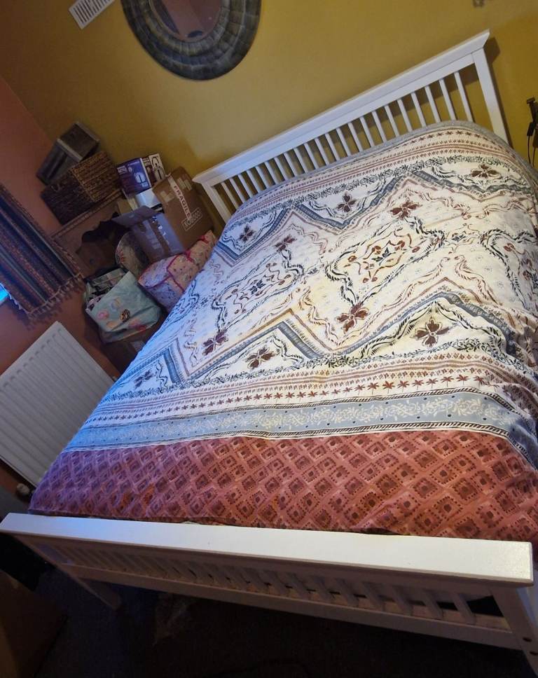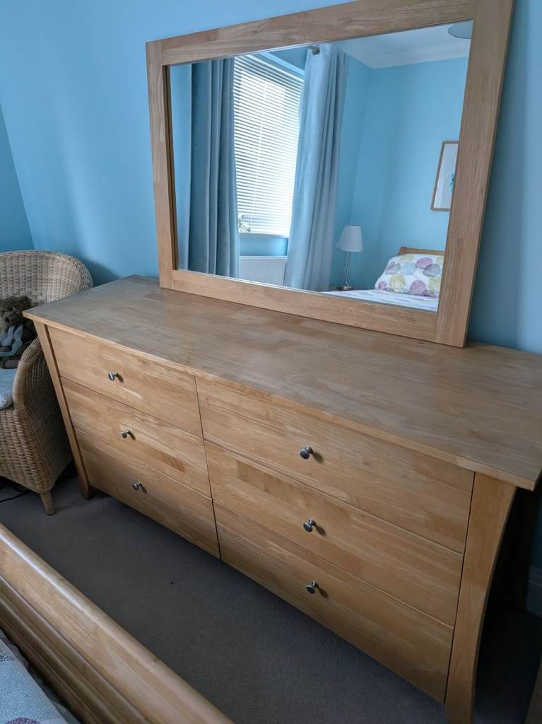 Modern, wooden king size bedframe c/w mattress, 6 drawer chest of drawers 150cms wide, 2 bedside cabinets 50cms wide and large matching mirror. Not flat pack, own transport required.