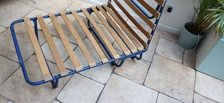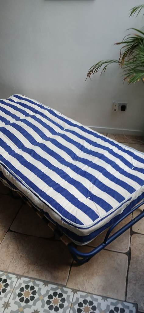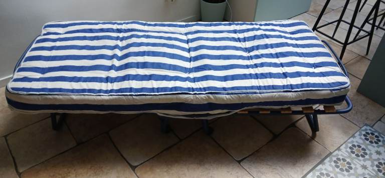 Free fold up bed, in good working order. Mattress has split in a section, but works fine.