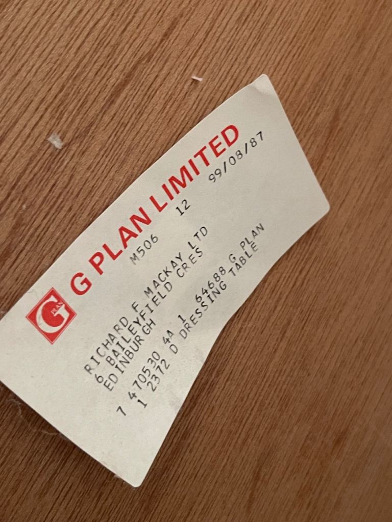 G Plan Teak ‘Albany’ dressing table and bedside drawers, all labels of authenticity are still attached.