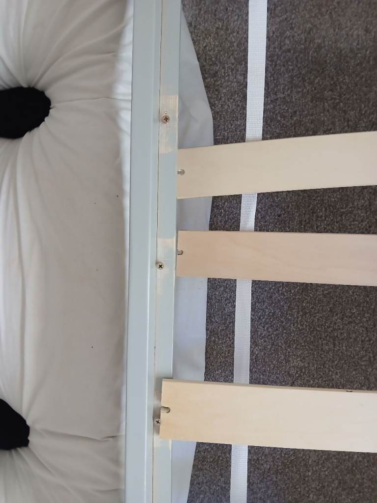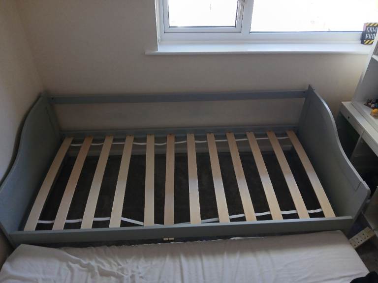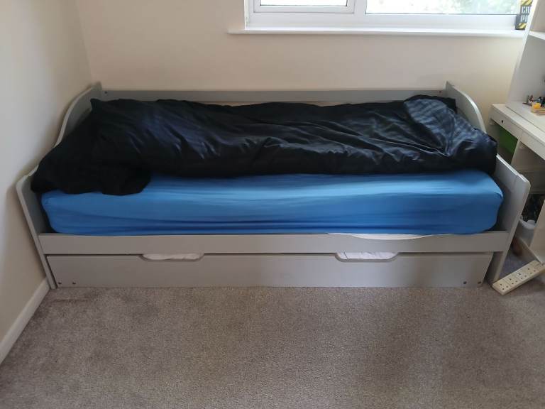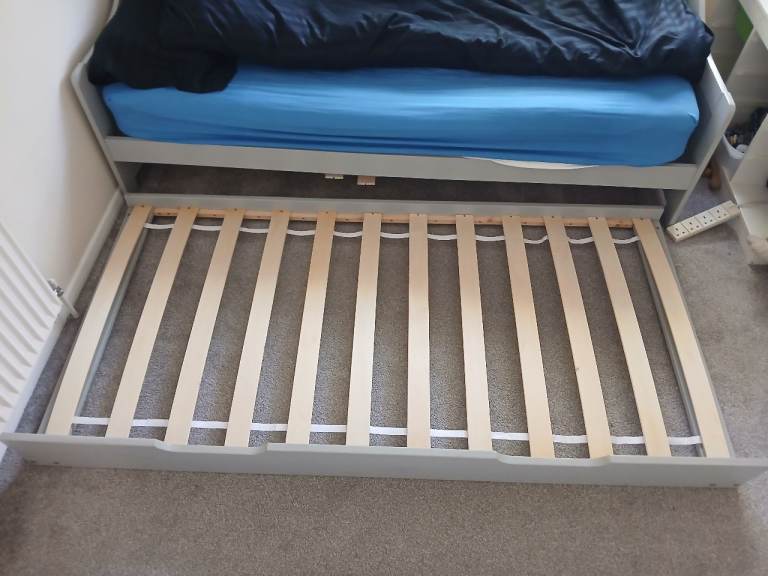 Grey wooden trundle bed. Second bed pulls out and lays on floor. Can be sold with one mattress. Few slats are unattached and will need a little bit of fixing. Can be dismantled or part dismantled. Collection only by 10th May.