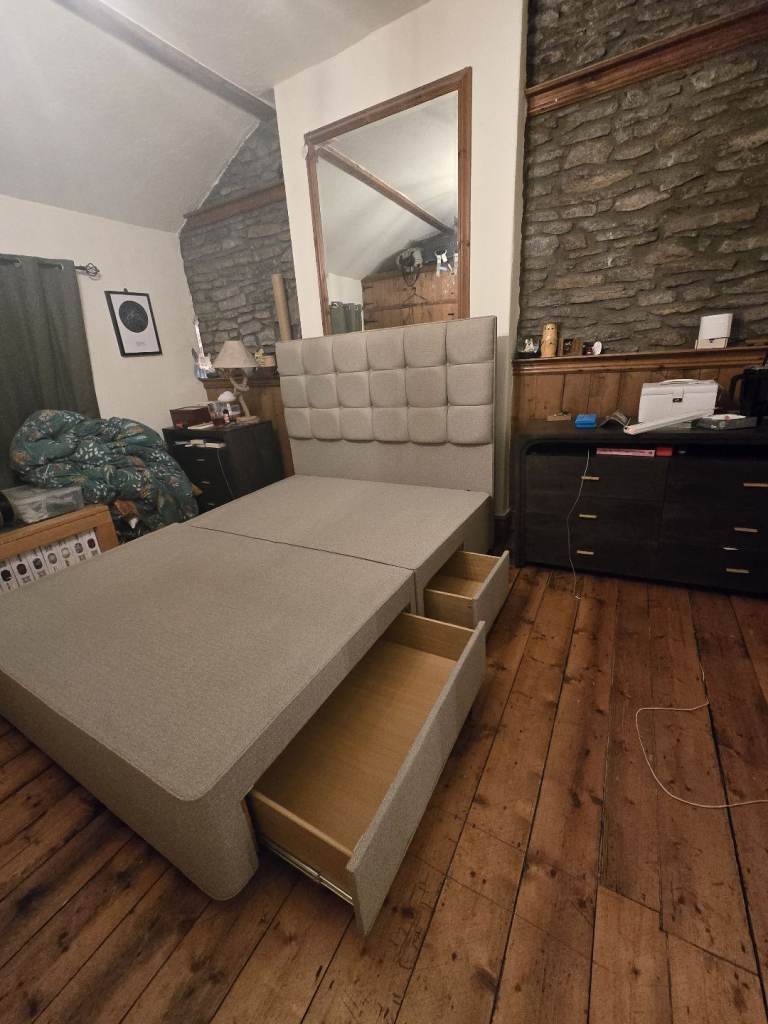 4 drawer king size divan bed with matching headboard, both by Hypnos and in Biscuit Weave. The divan bed is pocket sprung for extra comfort. The divan and headboard cost around £1,800 new and are around 4 years old. All in very good condition and is a luxury bed. Only selling as baby arriving soon and are reorganising.