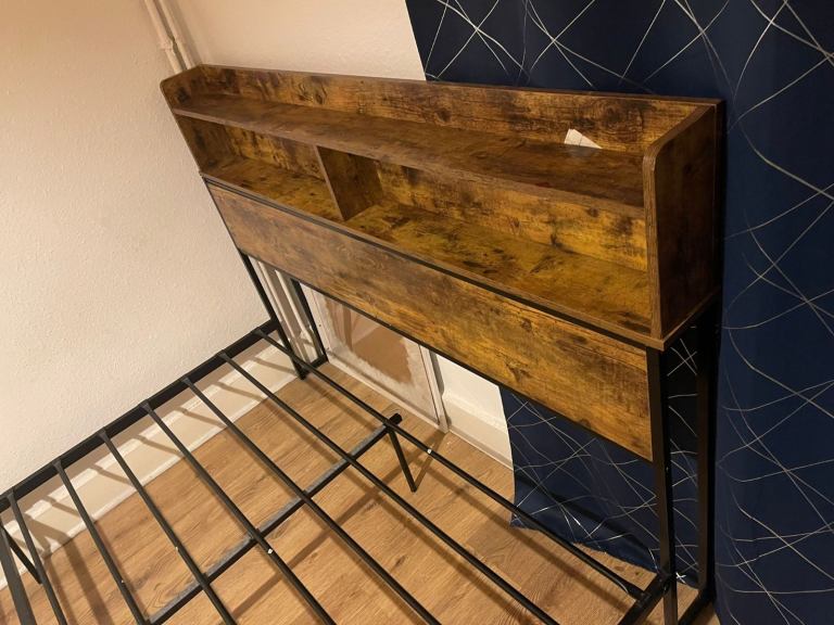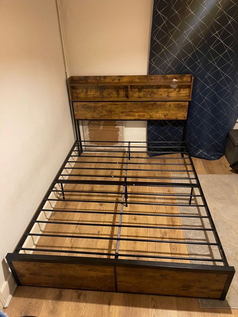 King Bed Frame Shelf Storage Easy Assembly, Metal Frame, Wood Platform, Easy Assembly Brown