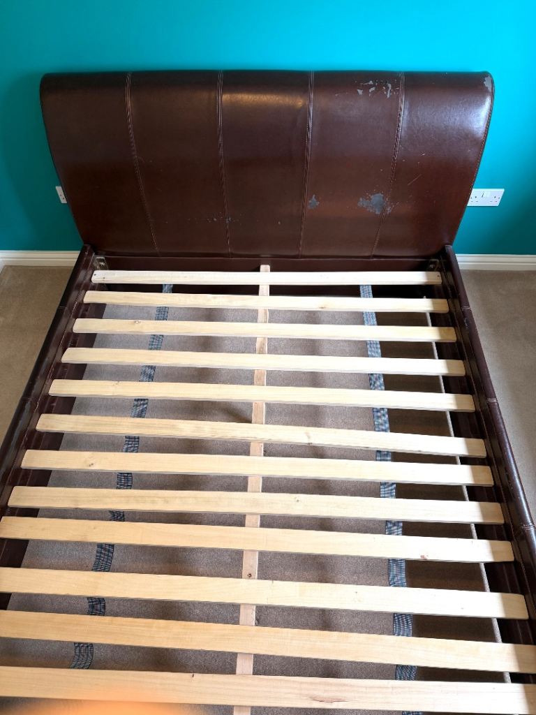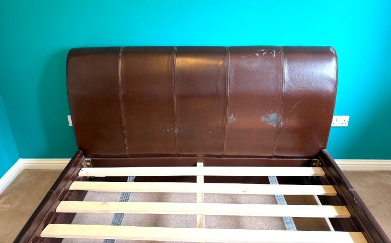 Bedframe is solid and sturdy, but the faux leather is shedding and could do with recovering. Mattress not included.