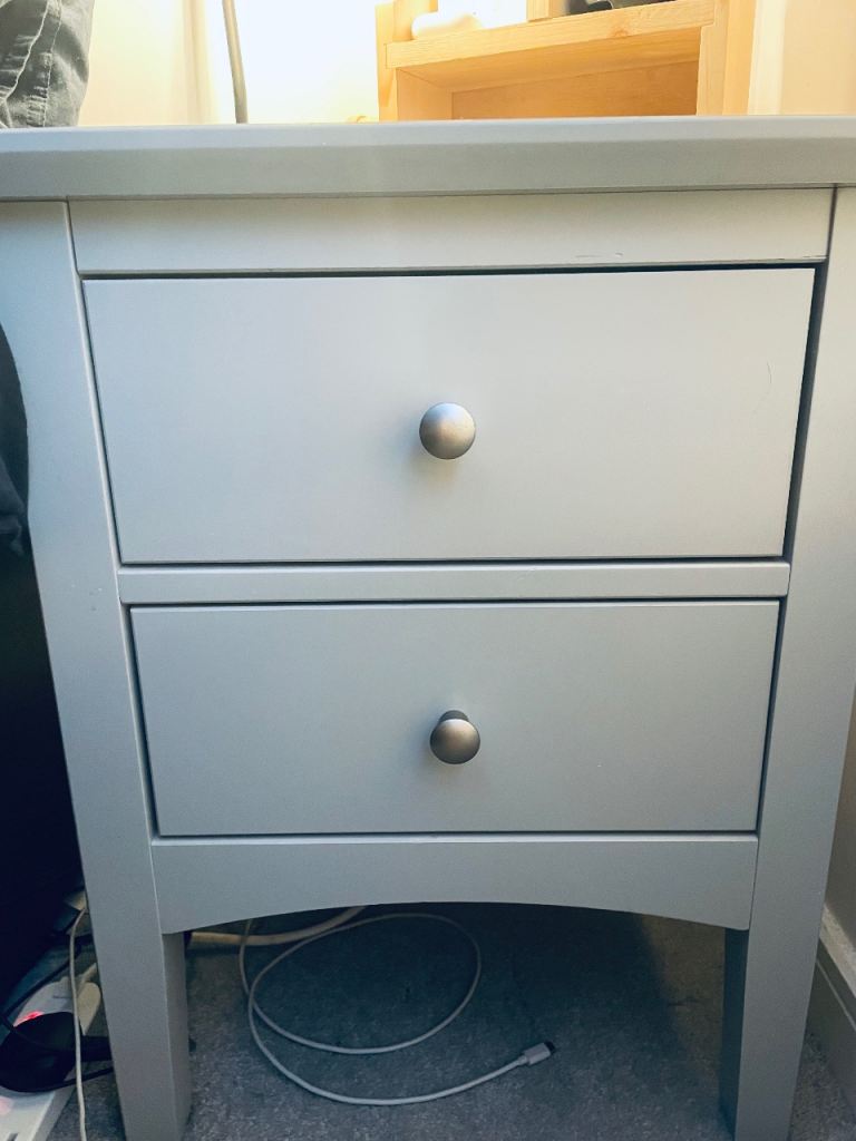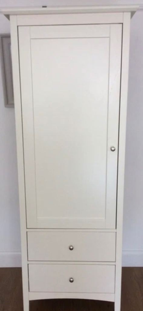 As new condition, light grey M&S Hastings solid wooden single wardrobe with 2 drawers and matching bedside table also with 2 drawer’s. From a smoke free home. Collection from East Kilbride.