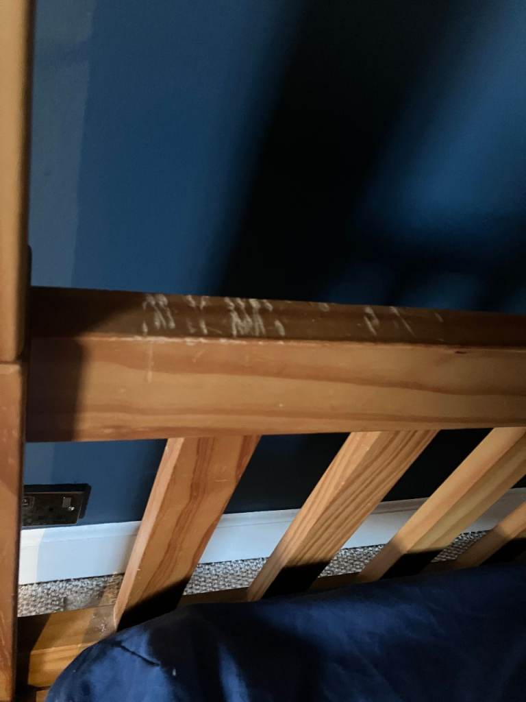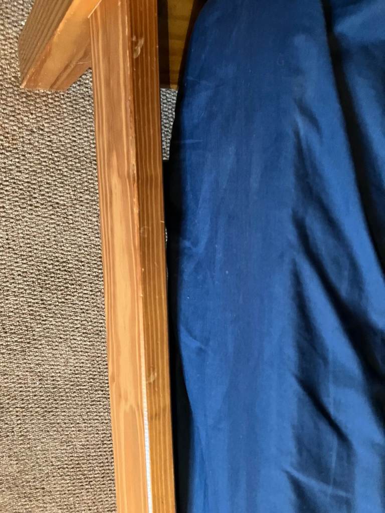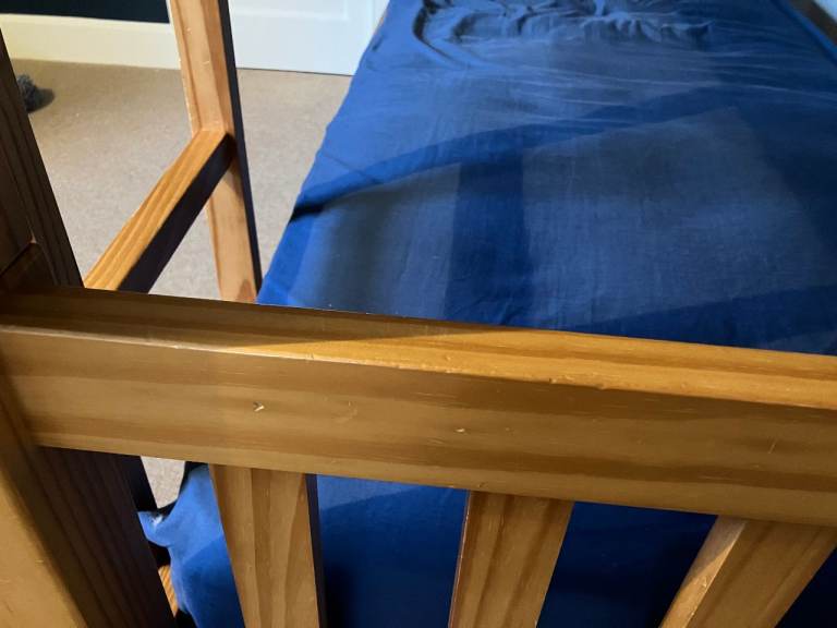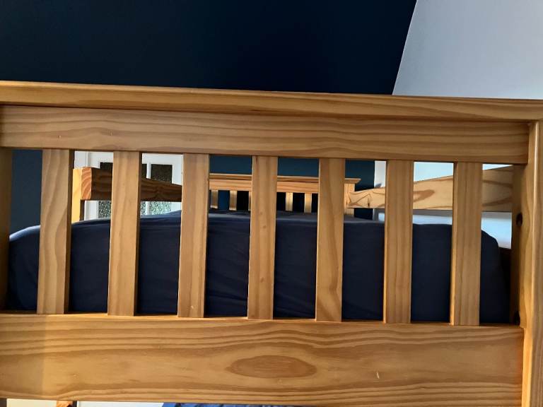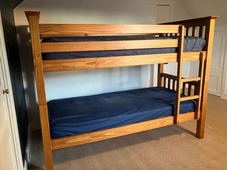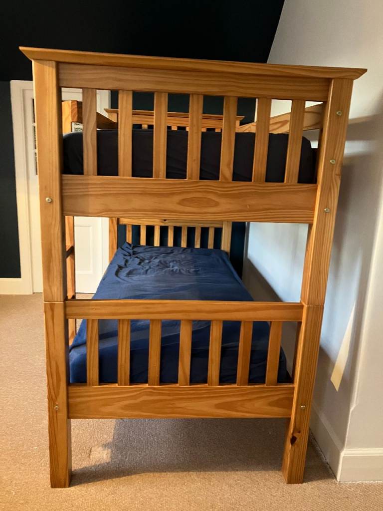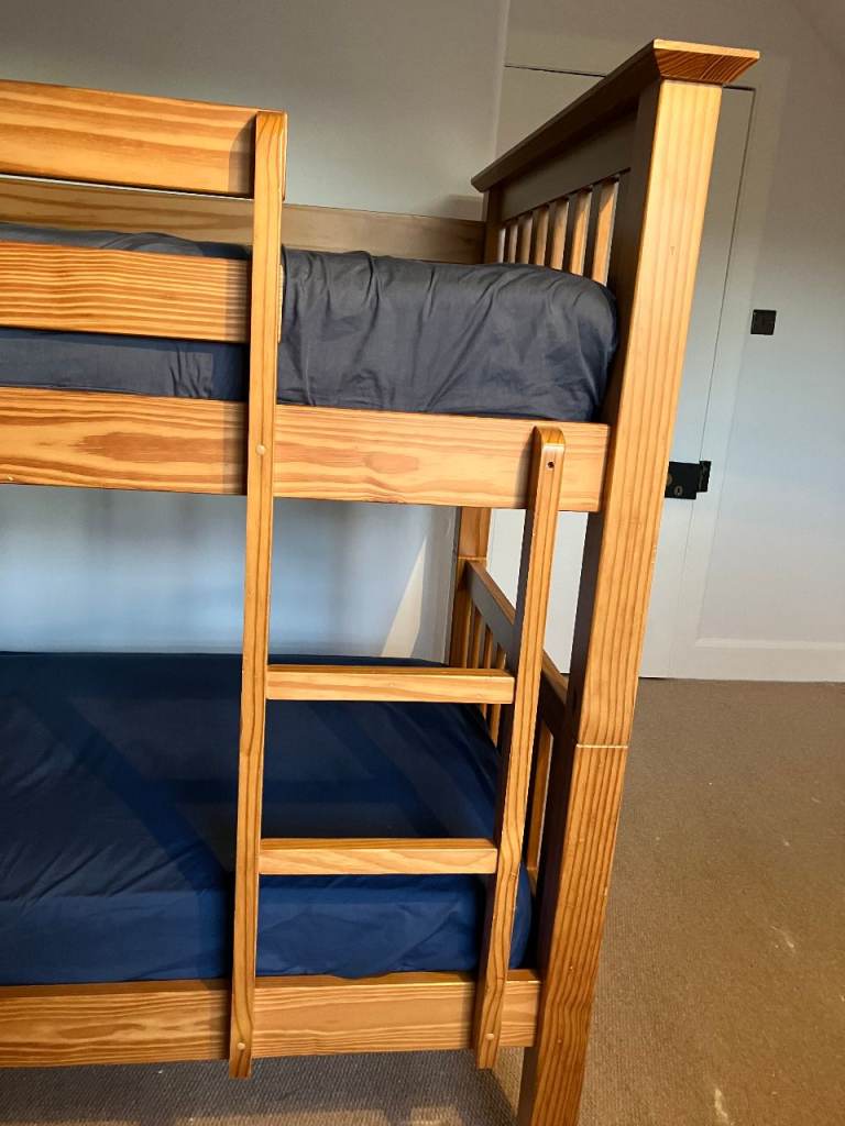Next solid wooden Bunk Beds for sale. Very sturdy and easy to assemble / disassemble. There is some slight wear in a few places (see photos) but the most obvious mark is where we attached a clip on light to the lower bunk bed but overall in good condition. From a smoke free, pet free home. There are 2 mattresses but these would probably need to be replaced as they have been well used.