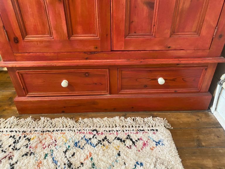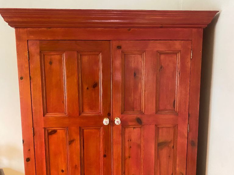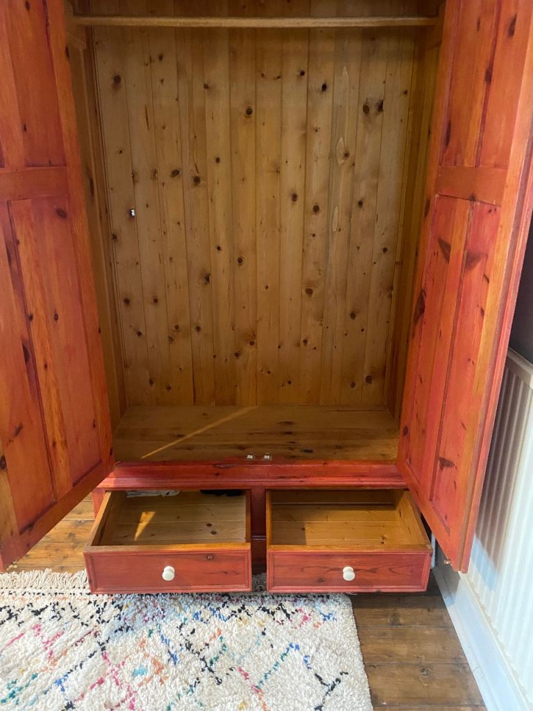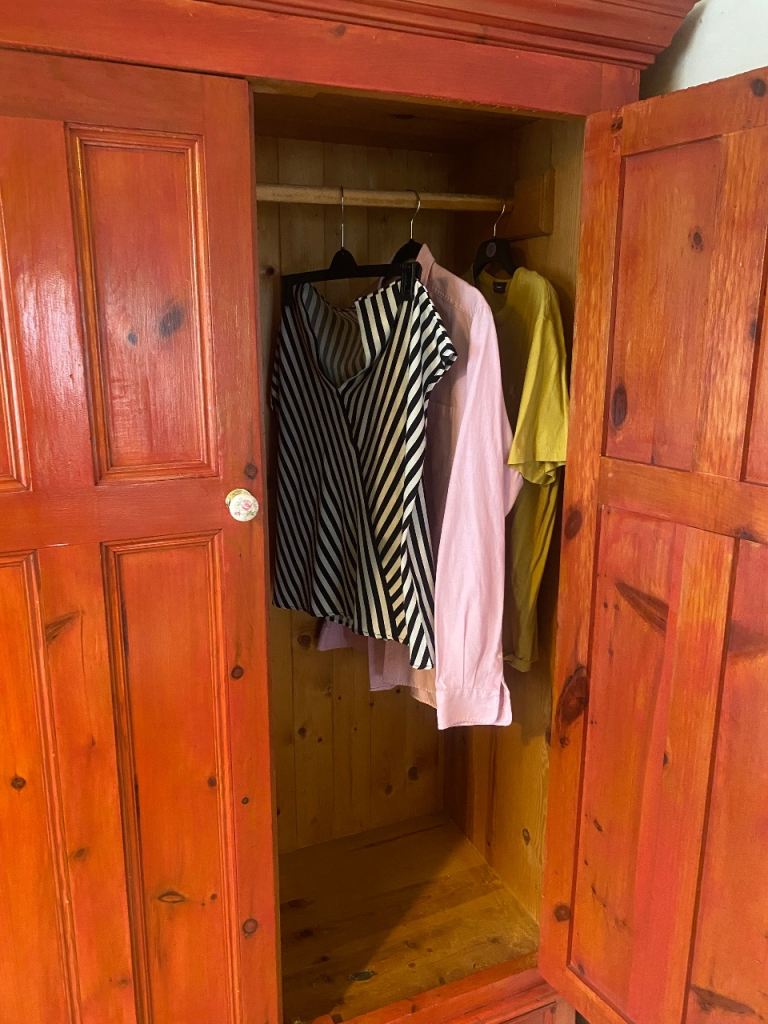 This large pine wardrobe has a terracotta stain and a light varnish. It is good condition with no obvious damage or scratches. The price reflects that the buyer will have to collect from Chorlton in south Manchester. I will send the dimension upon request as every time I add them to this section it says I have added an e mail address and won’t let me post !