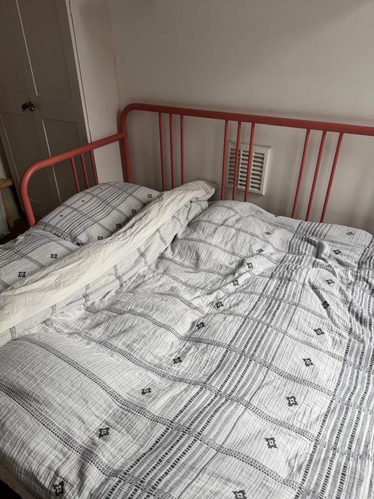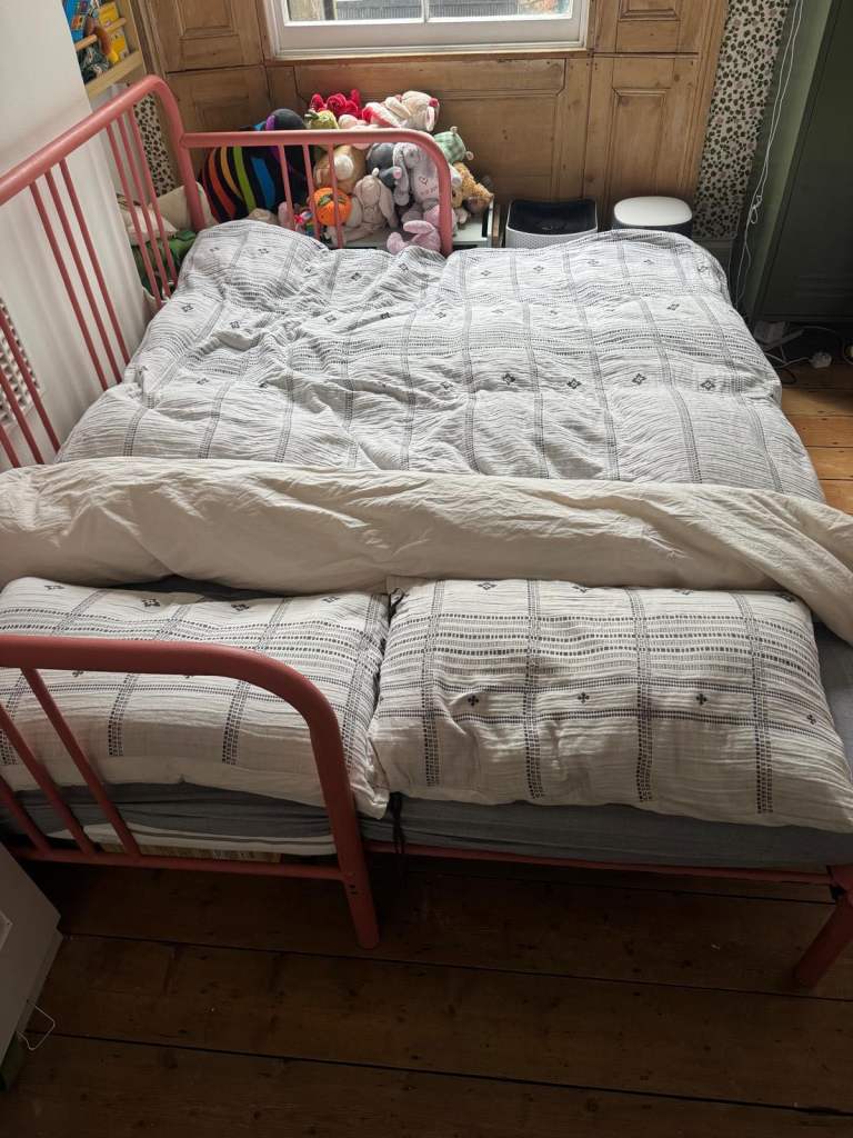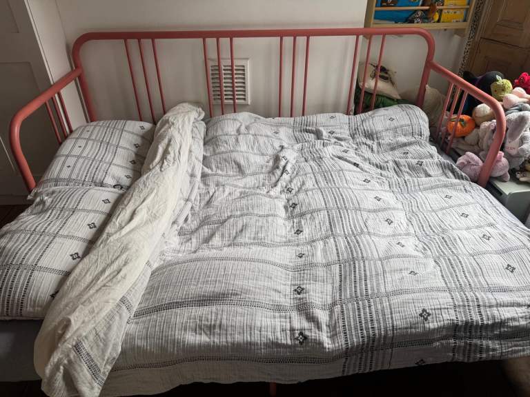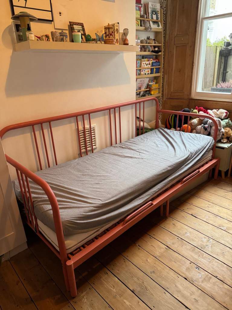 Selling this Ikea metal day bed frame which I had painted a pinky colour using Annie Sloan paint. Selling the frame only as we’ve kept the mattresses. It’s a single day bed that pulls out to a double and Ikea still sell the mattresses which go on it. In good condition, has all its screws etc and has already been dismantled so ready for collection.