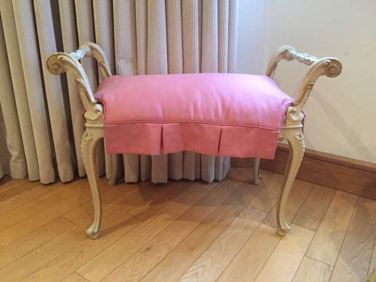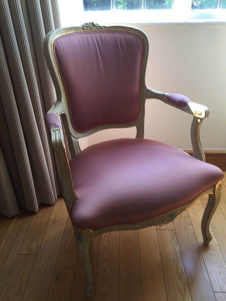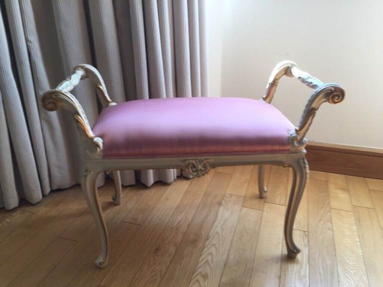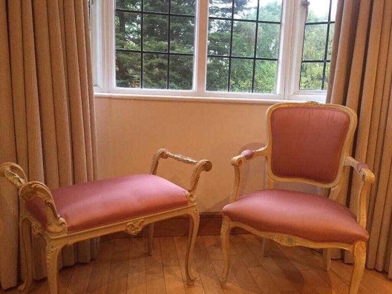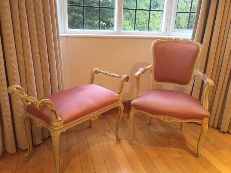 A beautiful SILIK baroque style arm chair and stool .It is made in Italy in solid wood and in very good condition . Both items are hand decorated and crafted in Italy in baroque style with italian silk upholstery. Both items will add chic and style in a bedroom,hallway, living room or dining room.