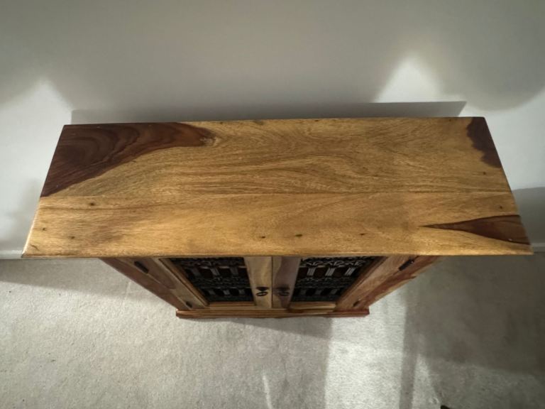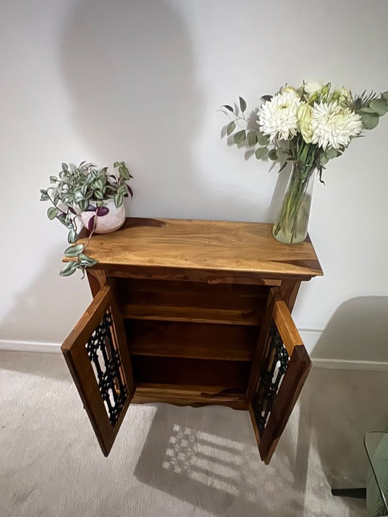 Solid wood storage cabinet with decorative carved panel doors. Sturdy and well made, ideal for hallway, living room or bedroom storage. Warm rustic/boho style that suits both modern and traditional interiors.