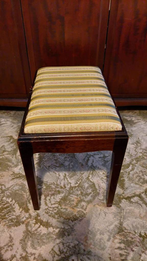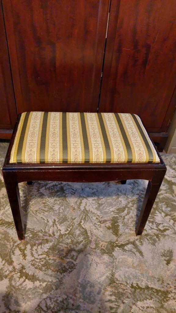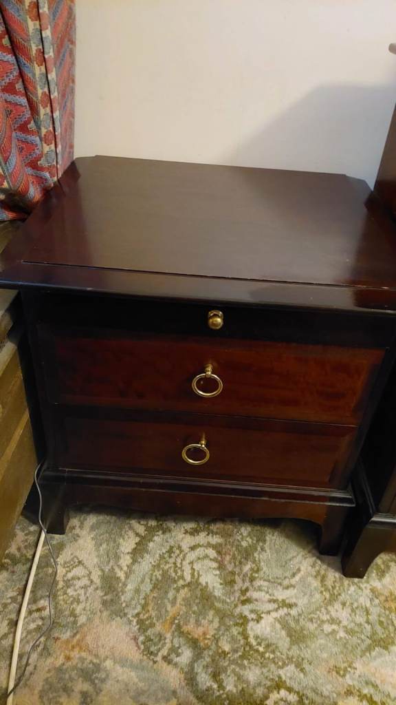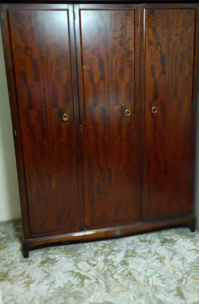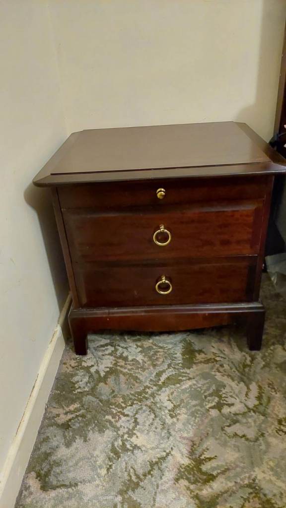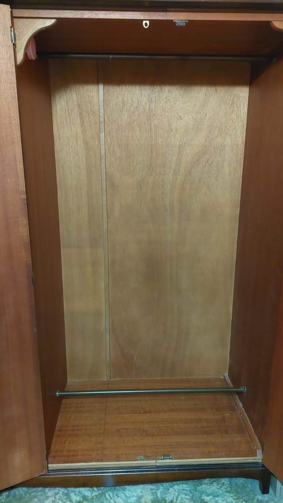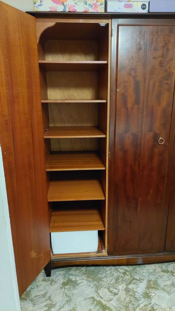 Sold as a seven-piece bedroom set. This Stag Minstrel vintage bedroom set includes six pieces, all crafted from mahogany with an unpainted finish. It features one double bed, a triple wardrobe, two pull-out tray bedside cabinets, a six-drawer chest with a mirror, and a stool. Finished in a classic brown, these pieces bring a touch of antique charm to any bedroom. Stylish and practical, this set is perfect for creating a cosy, timeless space. The wardrobe is in average condition, and the rest of the furniture is in good condition.