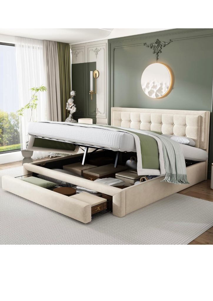 Ottoman Storage Bedframe with Hydraulic Lever and Drawer, Large Storage Space, Velvet Fabric Ottoman Lift Up