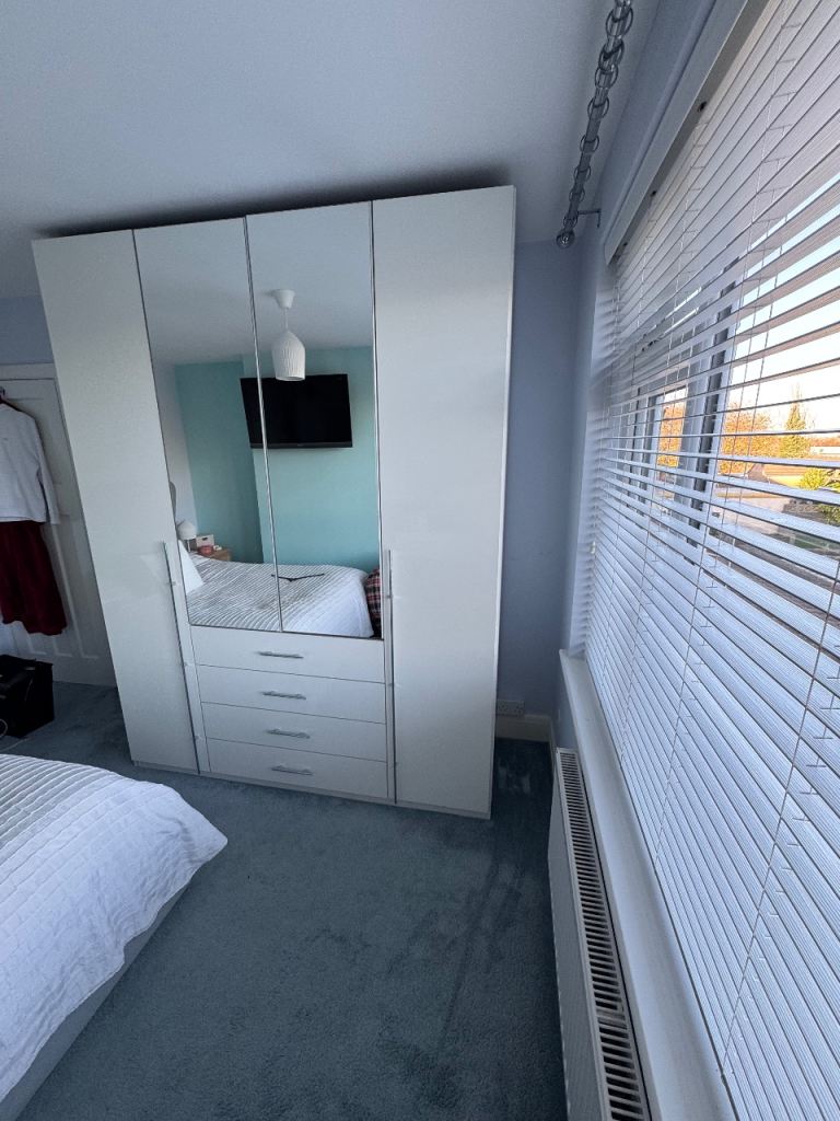 Posting for 10+ yearsTop quality German manufactured Rauch 4 door (bifold) white polyurethane gloss wardrobe unit.