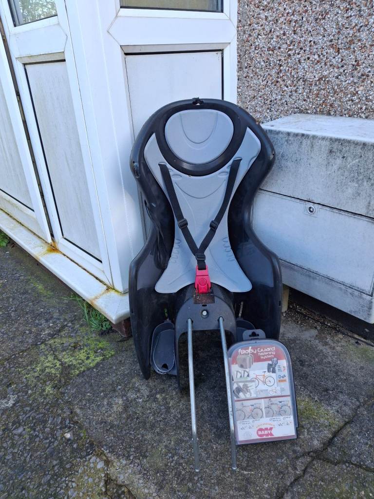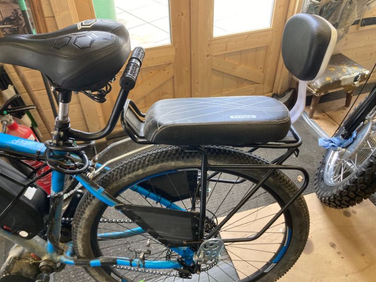 Child’s cycle seat on a rear rack with handlebars and footrests