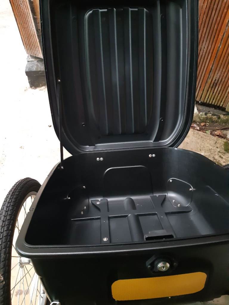 70 cms long, 50 cms wide, 30 cms deep. 2 spare tyres included. Never been used.