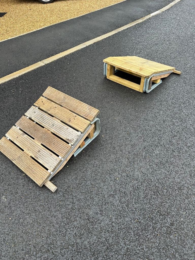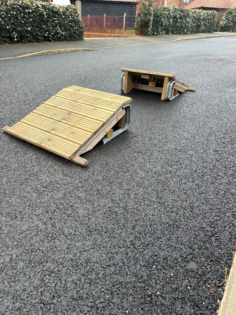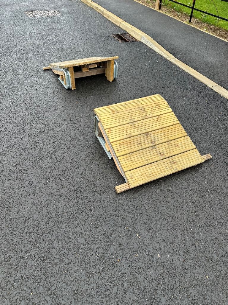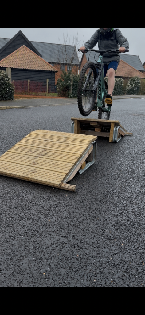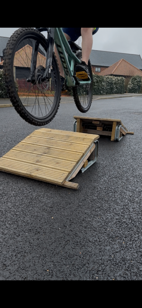 MTB bike ramps, a pair with launch and landing, ideal for learning to jump at home. Sold as a pair. Doesn’t include bike..