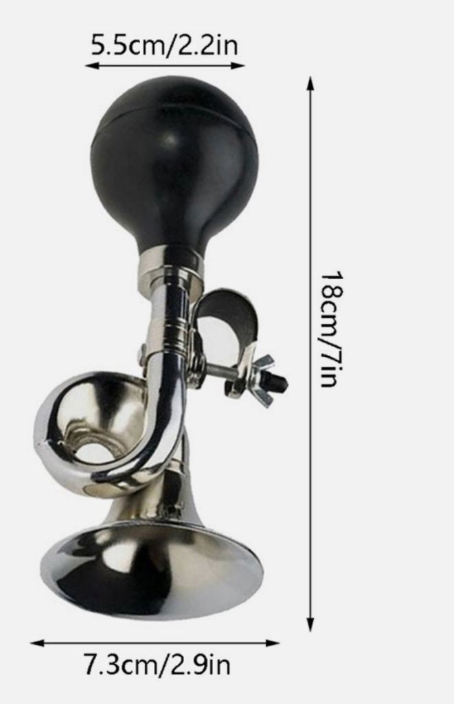 Horn size: 18 cm (7.0 in) long; Horn ball diameter - 5.5 cm (2.2 in); Metal Nozzle - 7.5 cm (2.9 in). Mounting size: Handlebar diameter - 2.2 cm (0.87 in).