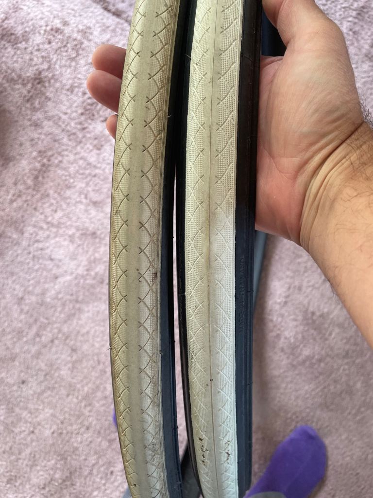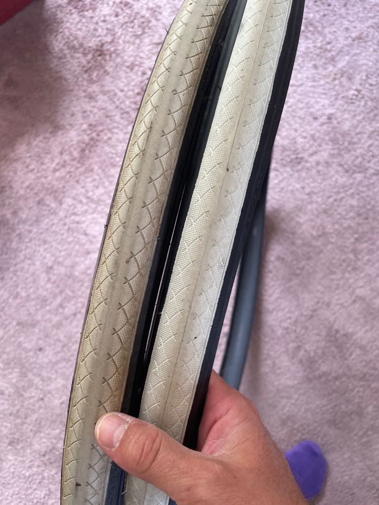 Almost new pair of tyres. Stylish white tread which is in decent but used condition. £12 the pair