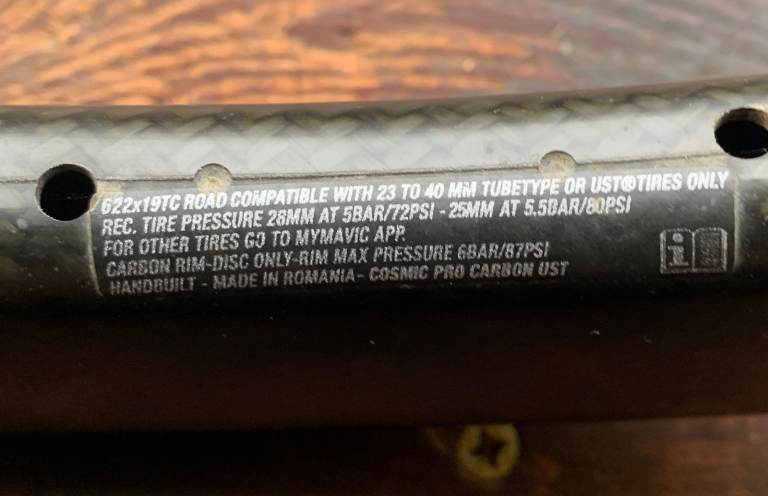 622x19TC Road compatible with 23 to 40 mm compatible tubetype. Rec. tyre pressure 28mm at 5 Bar/72 psi - 25mm - 28mm at 5.5Bar/80psi. Carbon rim-Disc only Max pressure 6 bar/87 psi. Handbuilt - Made in Romania - Cosmic Pro Carbon UST. Front wheel is complete and has 24 spokes. The other rim (rear) has 32 spoke holes.
