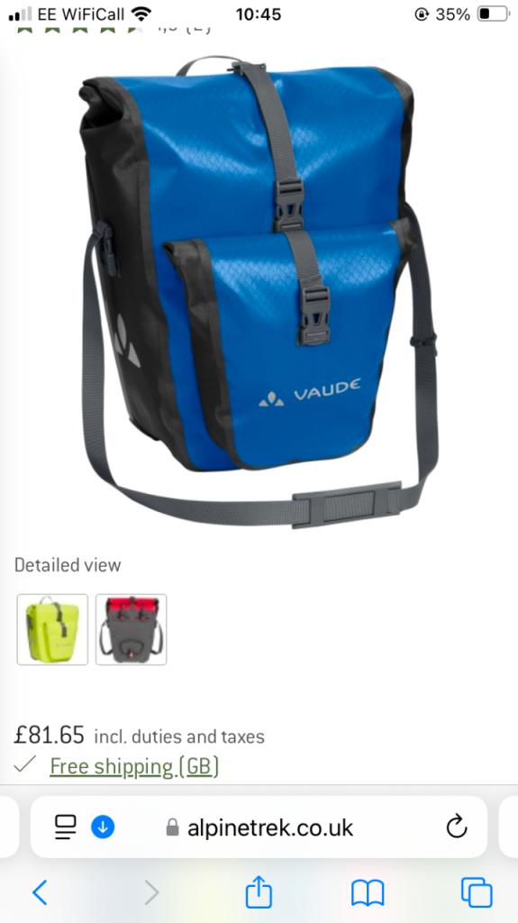 Selling a blue vaude cycle pannier I bought a while back when I used to bike around and hardly used. Minimal usage and good condition. There is a small white scuff mark I have taken a photo of. The last photo is of one I found online that is the same.