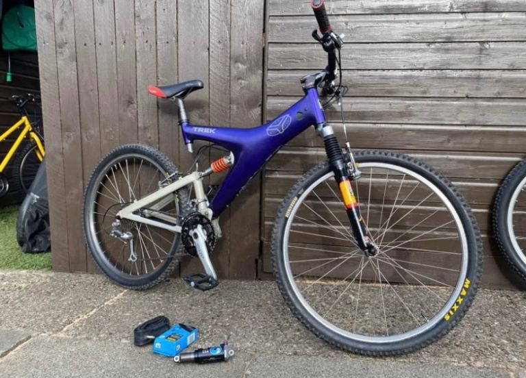 Next we have my Trek Y11 OCLV Carbon Full Suspension from 1997 in a stunning purple, shimano xtr components, bontragger seat, the bike is all set and ready to go with spare tubes and float.