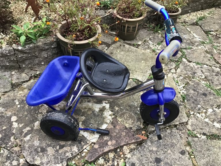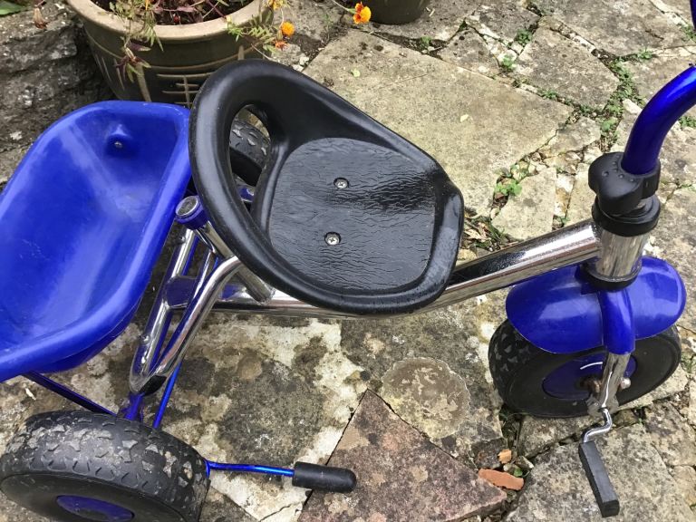 Child’s tricycle blue and chrome great grandson has outgrown it good condition.