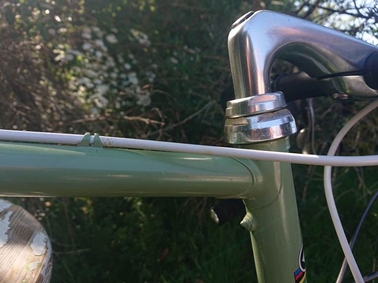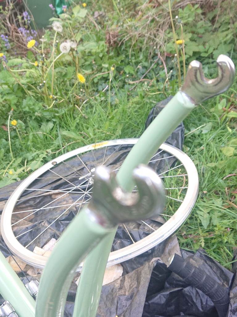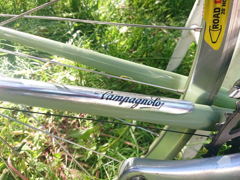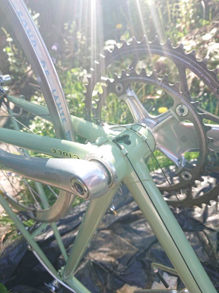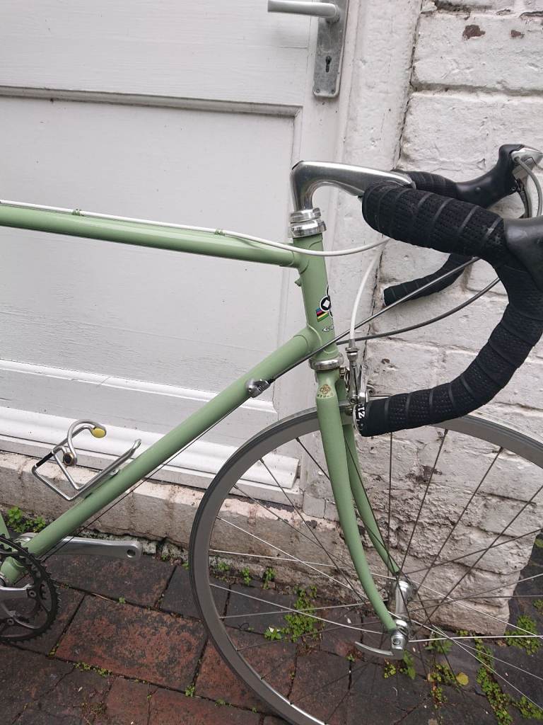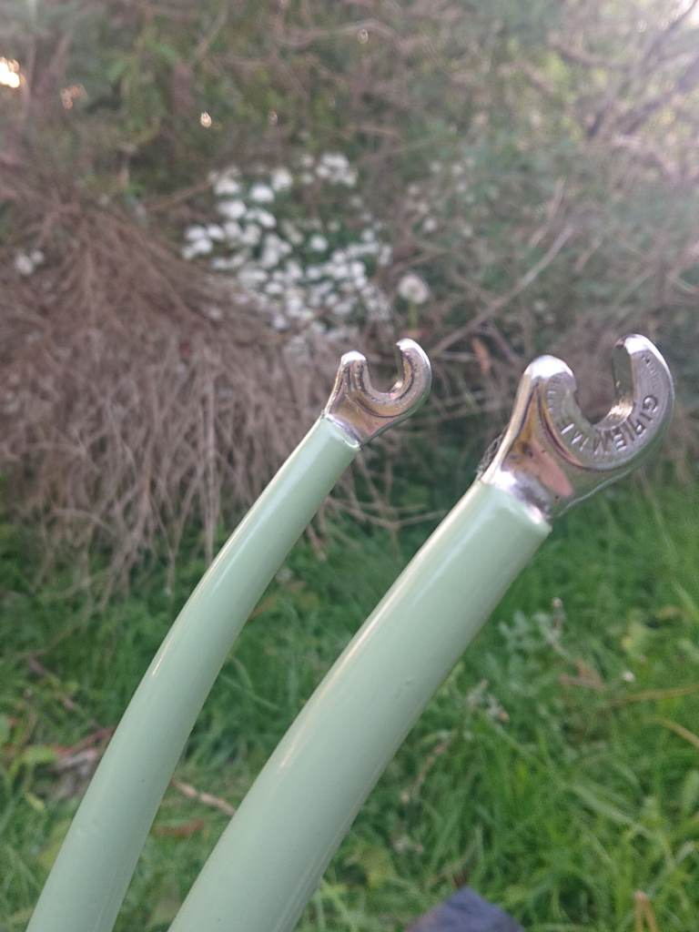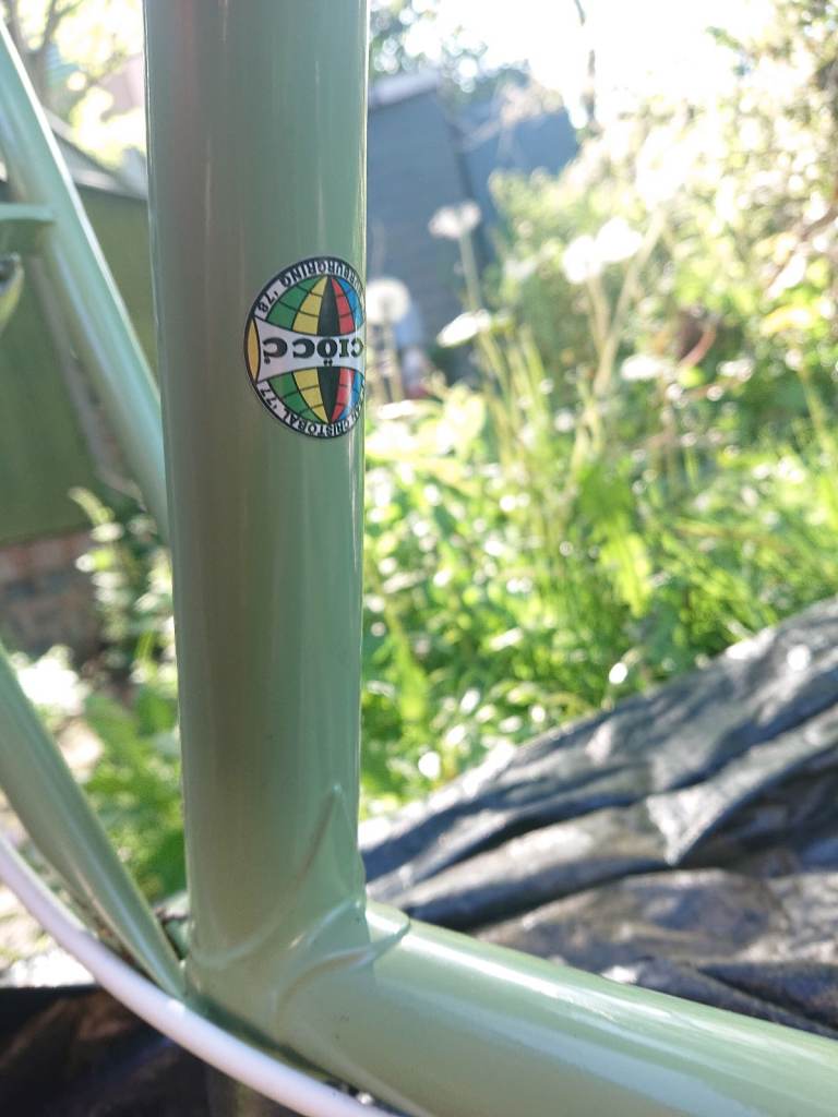 Ciocc 'Designer' pantographed frame using Columbus Special Aelle Tre Tubi steel tubing. Light green powder-coat paint with chrome Campagnolo dropouts. I have also gilded the pantographs with gold and lacquered it in. I have only used a few Ciocc decals as I like it like this but will include the rest.