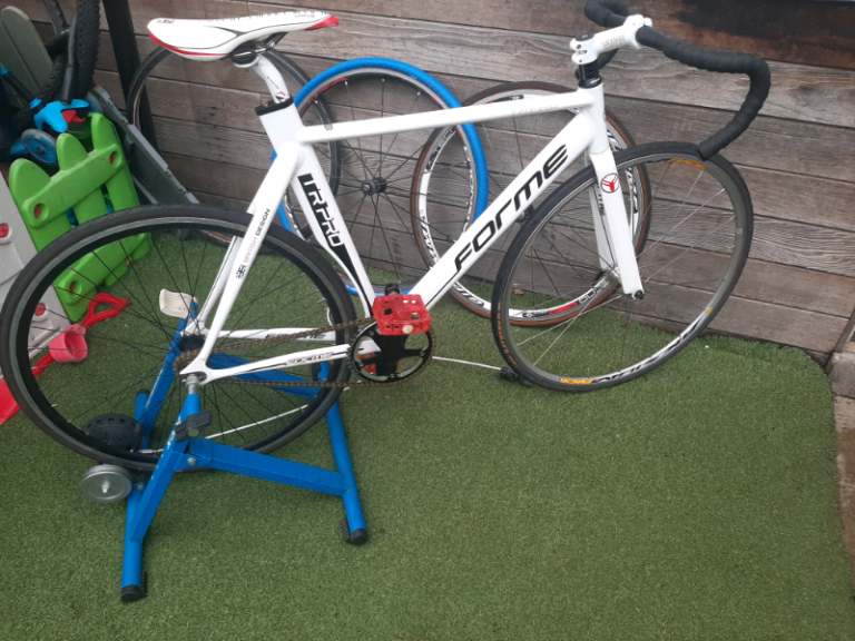 Mtb handle bars. Forza seat post. Fantastic ride. Also comes with original track bike set up. Forme TR Pro frame lightweight aluminium 56cm. Forme carbon fibre forks. 700c wheels Mavic aksium race front. Rear standard Single speed. Also spare wheels and tyres. One23 stem with Barrelli bars Road bike drop bars. Fantastic lightweight bike comes with turbo trainer for home use. Swaps over from one to the other easily. Cost lots to build. May swap for decent 5th scale rc car or full suspension bike