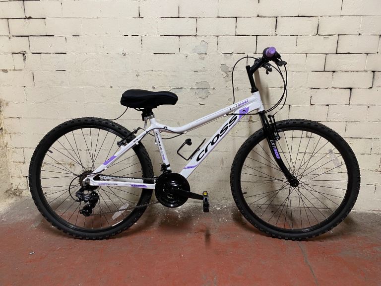 Cross 24” wheels and small frame. White with purple accents, as new condition- 120
