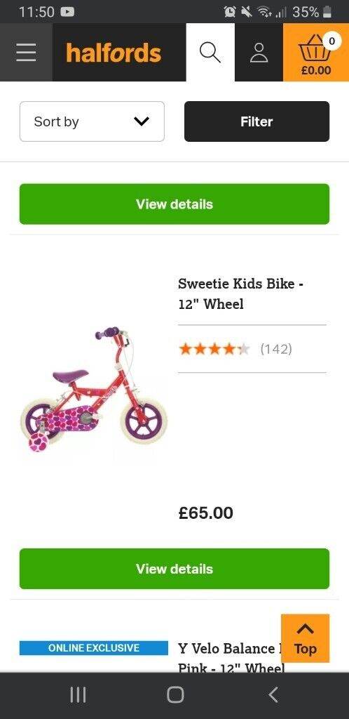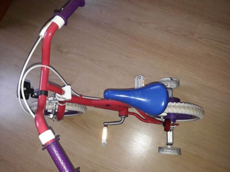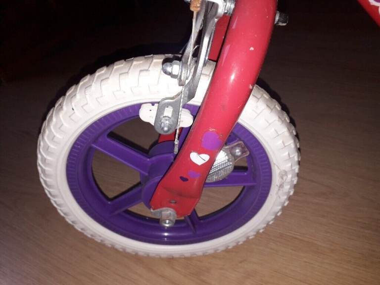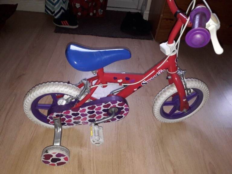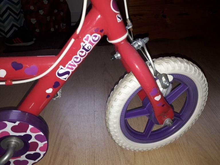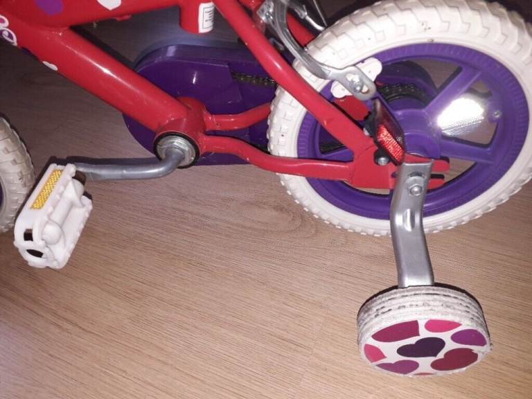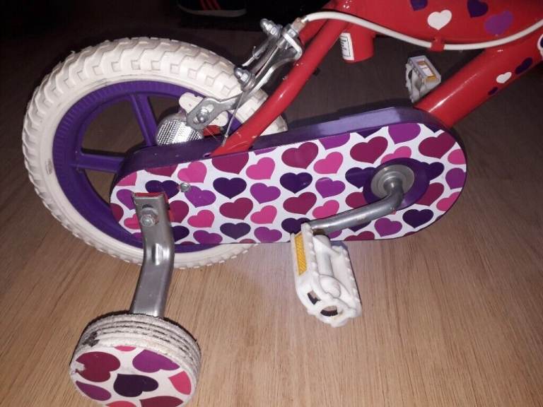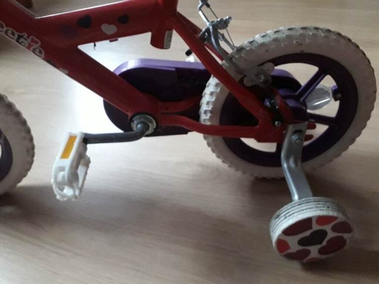12" wheels Red/hearts bike with stabilizers for girls. Excellent used condition, hardly used, clean and tidy, stored in worm and dry room.