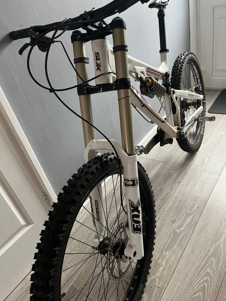 White fox 40s , double barrel cane creek rear shock , loads and loads of trick bits , comes with 12 basically brand new spare tyres , a full compete dt swiss front wheel with a red hope hub , a full spare rear end with all bearings