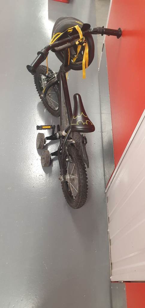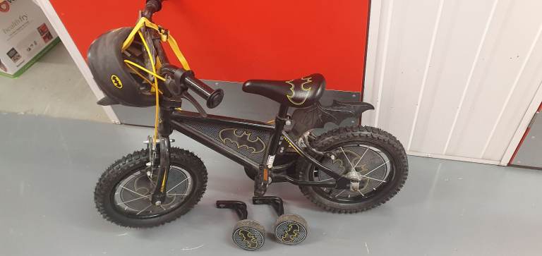 Kids Batman bike complete with stabilisers and Batman helmet.