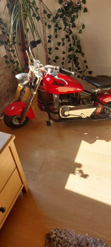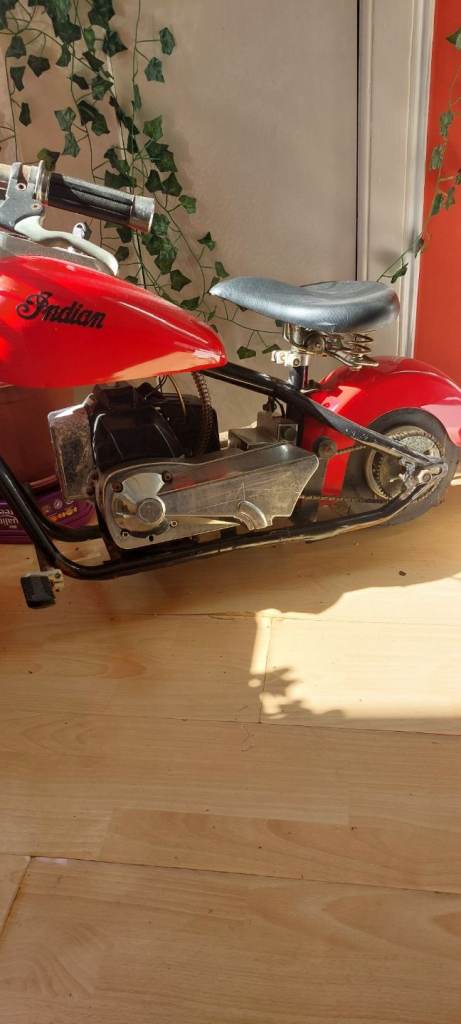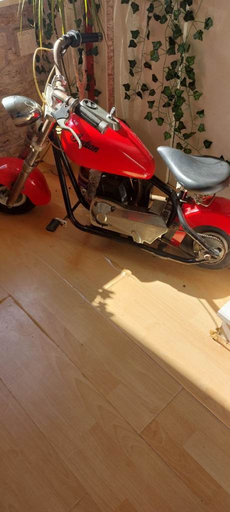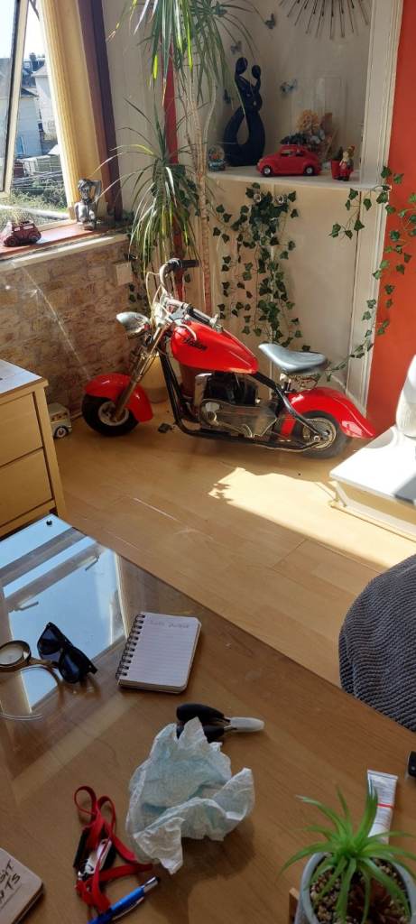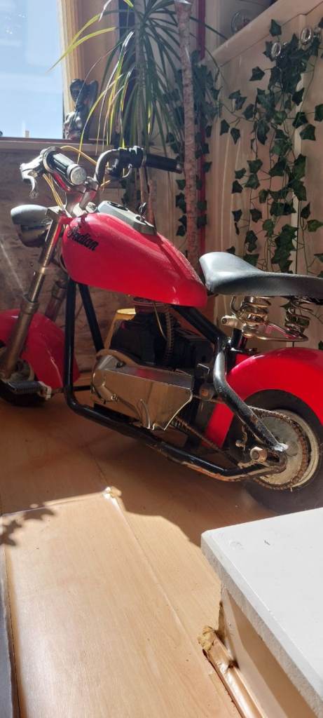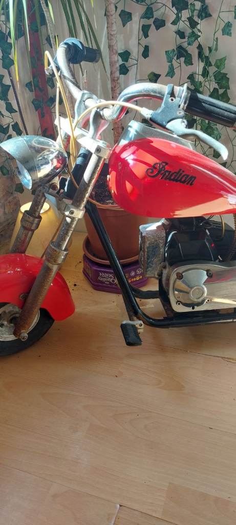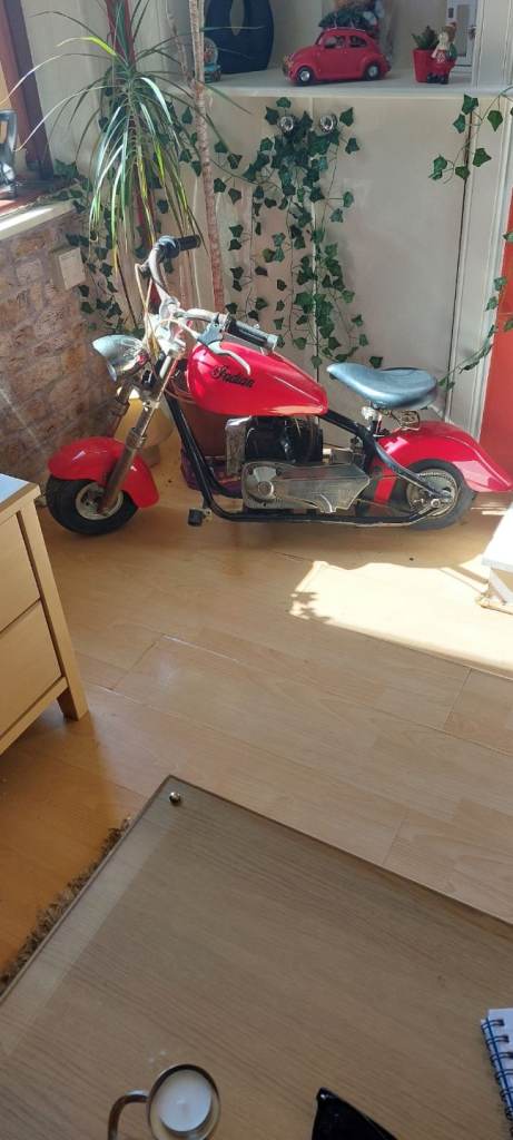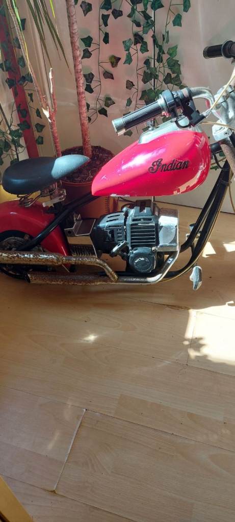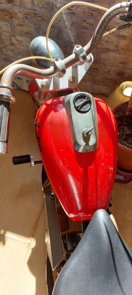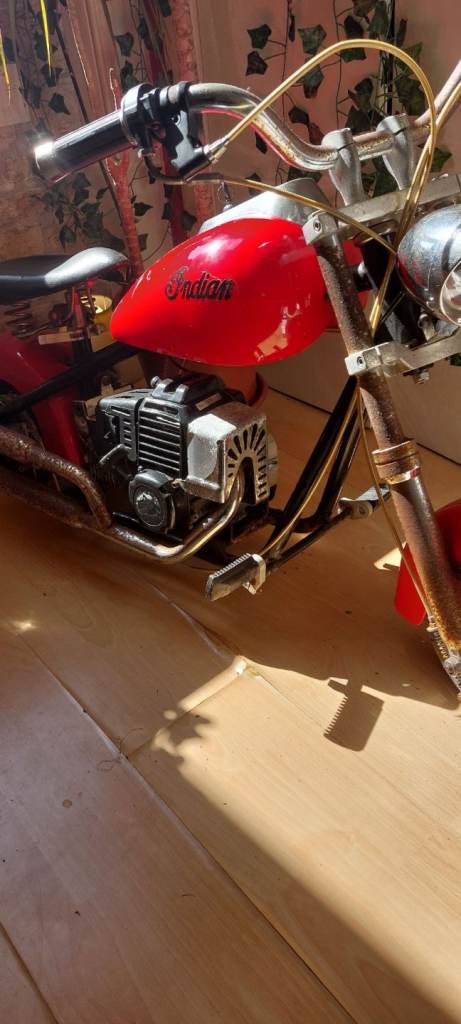Mini chopper style 43cc petrol bike. Nice decorative item or can be fuelled up and run. From the 80's and has patina.
