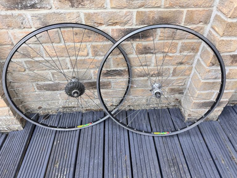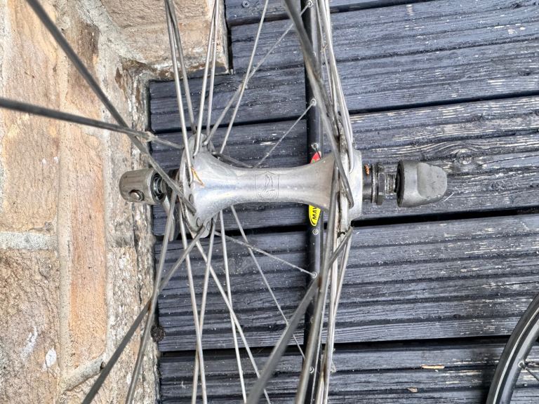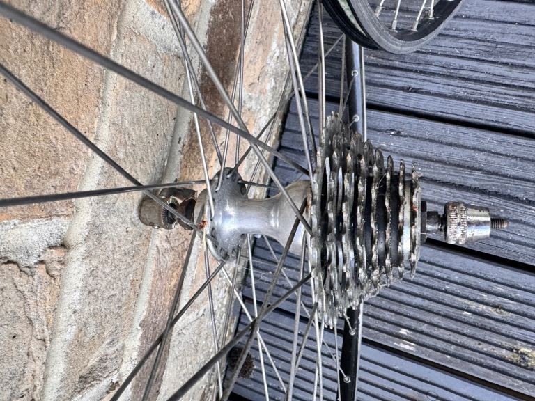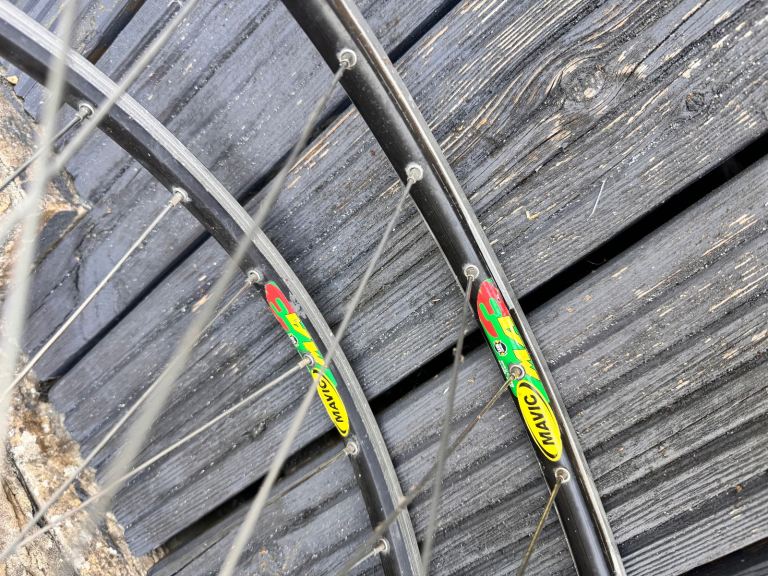 Campag hubs and 8 speed cassette to Mavic MA3 clincher rims; rims are very mildly used and retain most of the original ridges on the brake surfaces