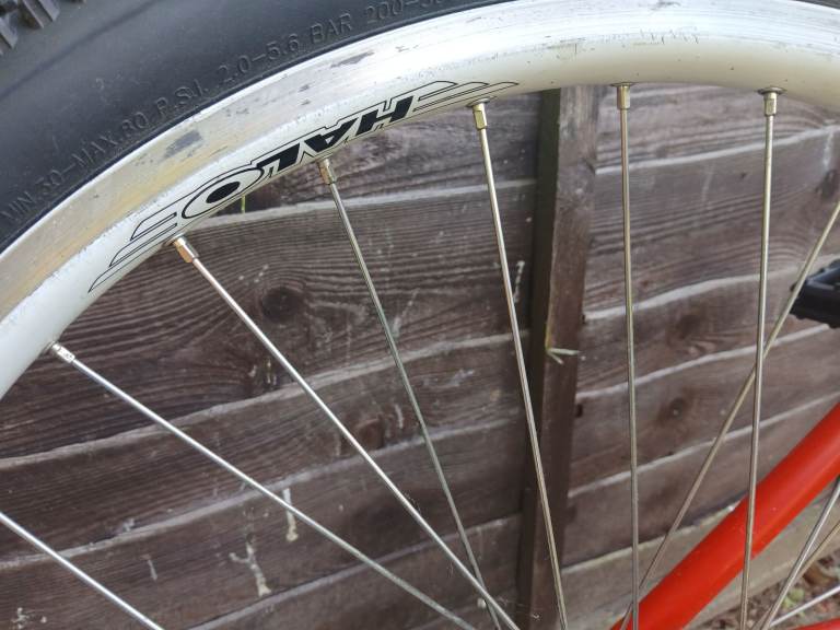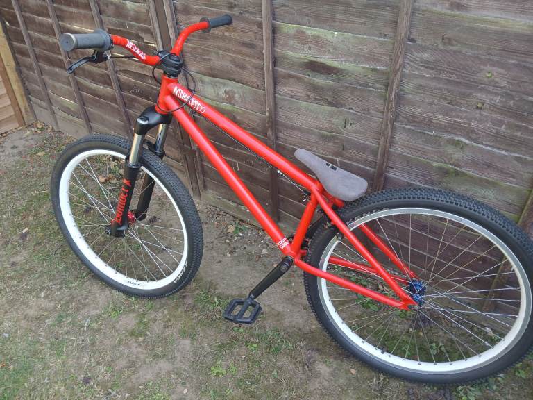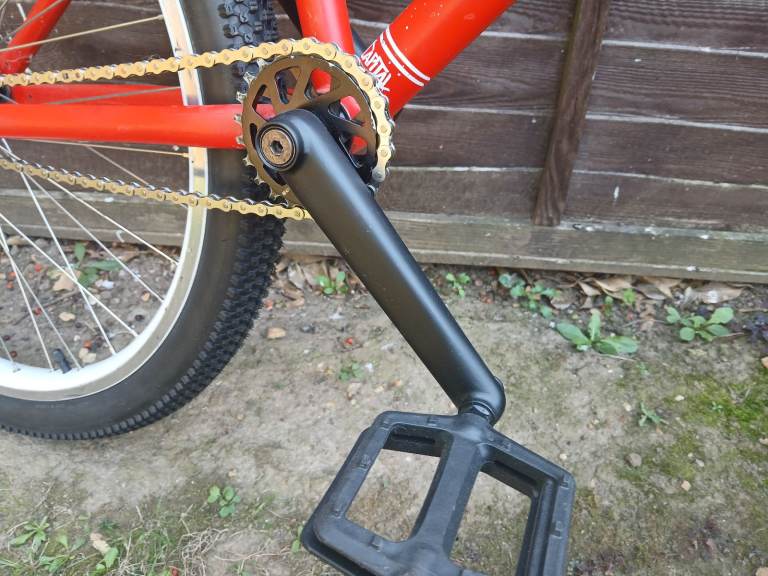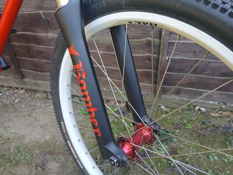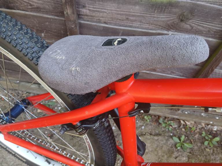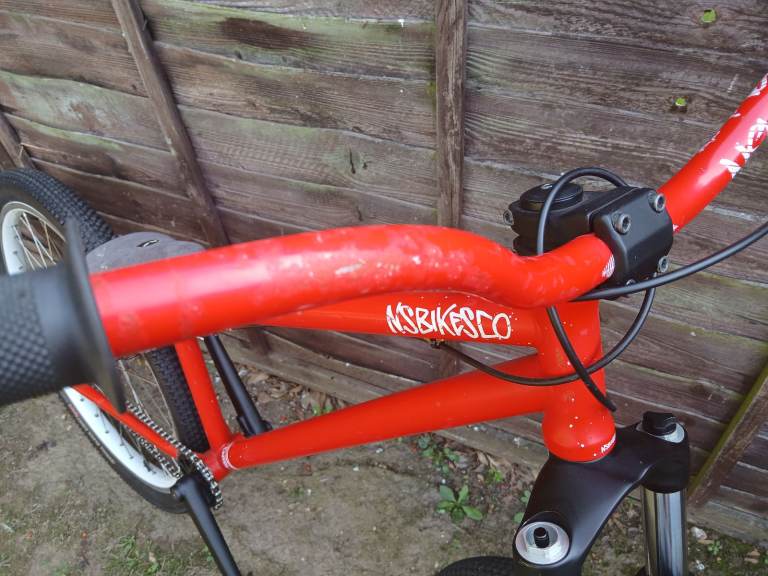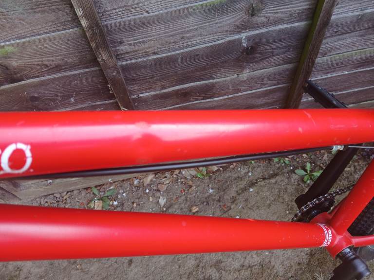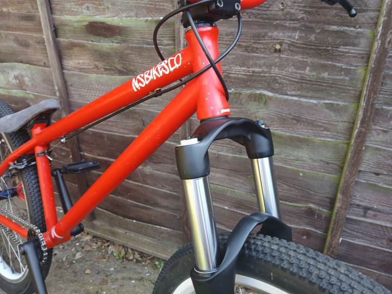 I cleaned and tidied this up a couple of years ago meaning to ride it but it's sat gathering dust since. There's quite a bit of touch up on the frame and bars and theres a small dent on the top tube that I'd not noticed before. The cranks and fork have been resprayed and stickered. New bearings in front hub. The forks hold air. They're a bit clunky as they don't have any rebound.